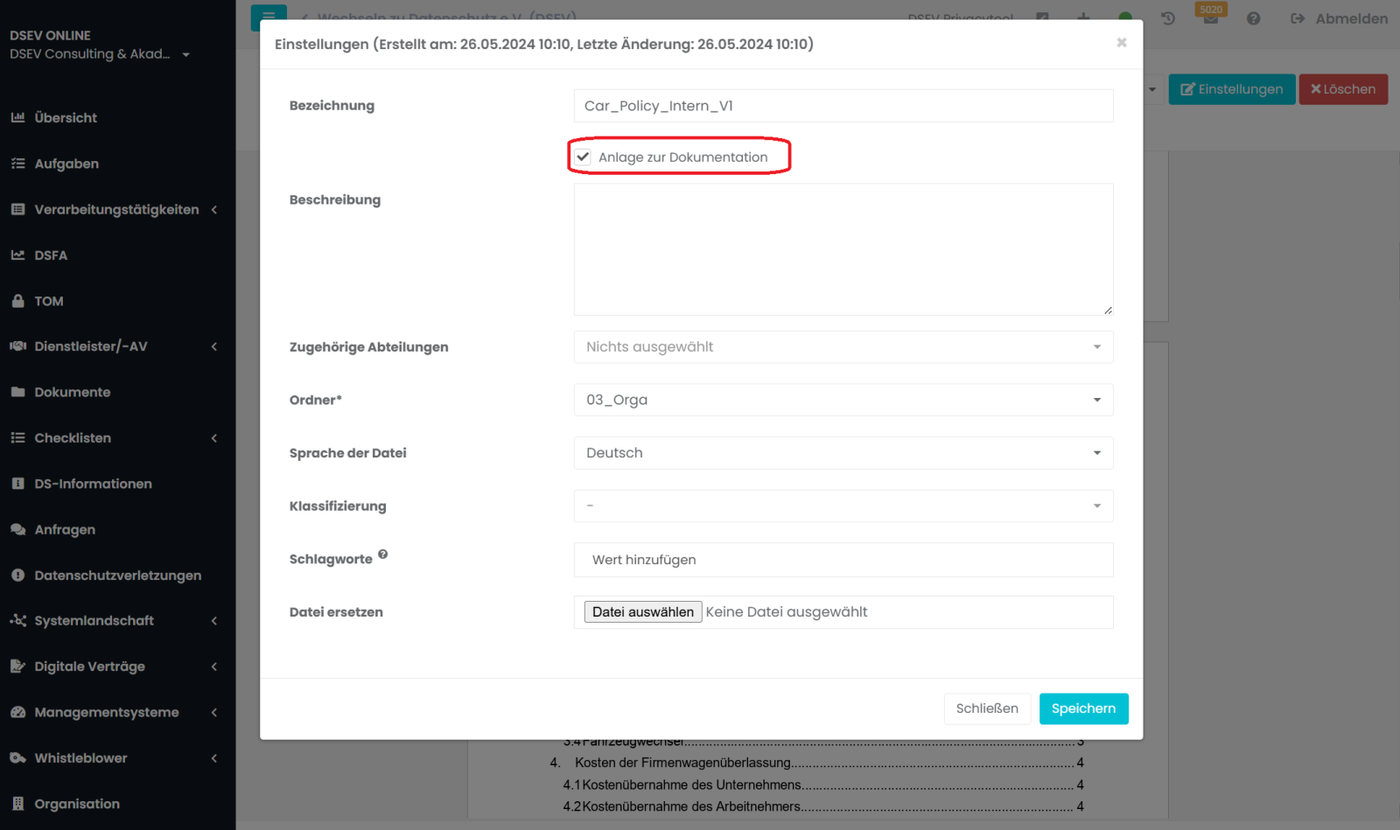 Sie können Anlagen zur PDF-Dokumentation erstellen in dem Sie eine PDF-Datei im Dokumenten Modul hochladen. In der Dokumentenansicht können Sie auf Bearbeiten klicken und anschließend die Option Anlage zur Dokumentation aktivieren.