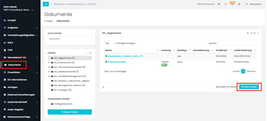 Vorgehensweise: Navigieren Sie zu „Dokumente“ und klicken Sie auf „+Datei erstellen“.