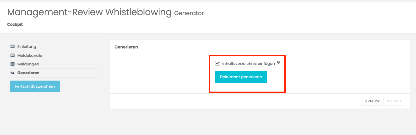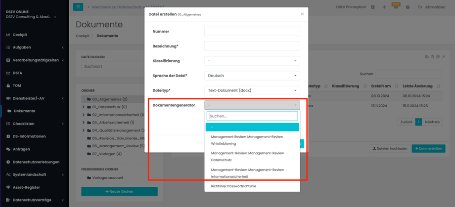 Nachdem Sie alle Eingaben abgeschlossen haben, klicken Sie auf „Dokument generieren“. Das erstellte Dokument wird Ihnen anschließend als Word-Datei zur Verfügung gestellt und gleichzeitig im System gespeichert.