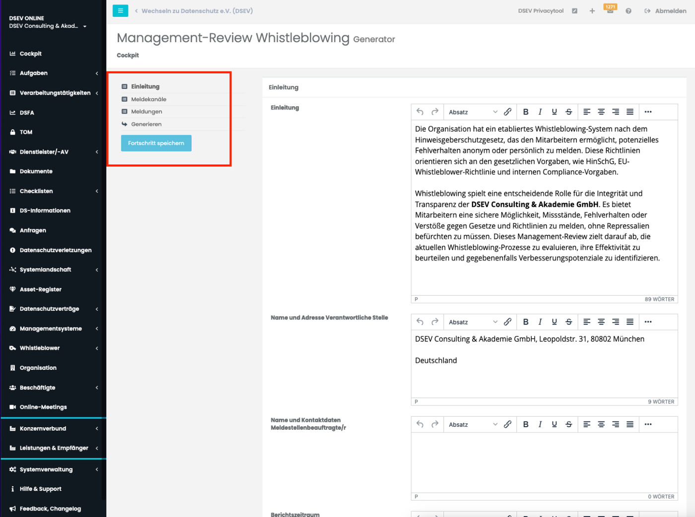 Mit diesem Tool können Sie derzeit Jahresberichte für die Bereiche Datenschutz, Informationssicherheit und Whistleblowing erstellen.