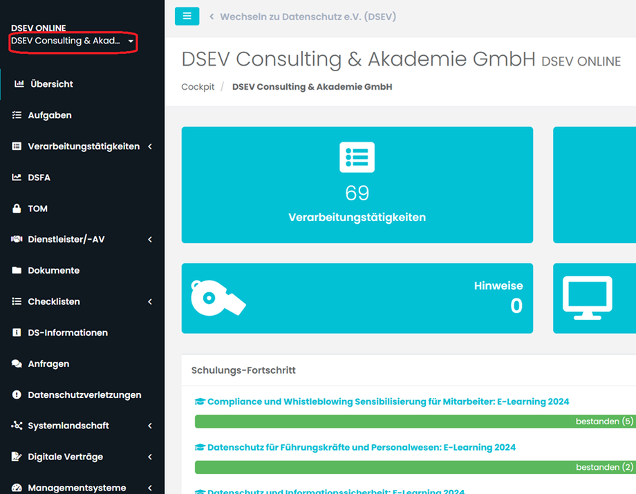 Im System sehen Sie immer die Inhalte und Daten der aktiven Organisation. Es kann nur eine Organisation zeitgleich aktiv sein. Welche Organisation Sie gerade bearbeiten sehen Sie oben links unter dem Benutzernamen.