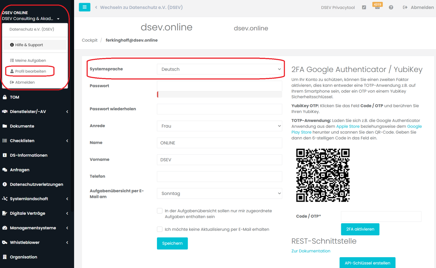 Im Login-Bereich können Sie die Sprache der Oberfläche in der Fußzeile wechseln. Im angemeldeten Zustand finden Sie die Option im Bereich Profil bearbeiten.