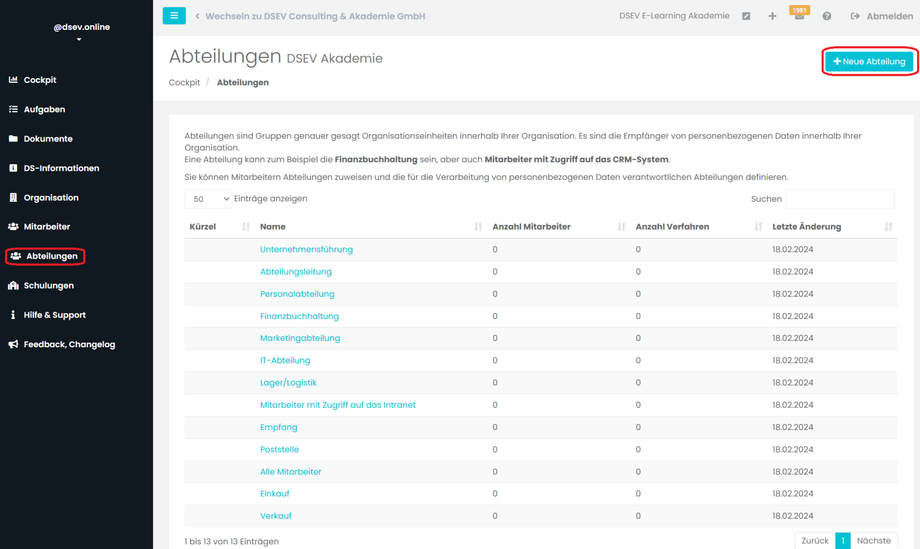 Abteilungen enthalten die Mitarbeiter, die in ihnen tätig sind. Sie können die Abteilungen analog zu Ihrer Betriebs- oder Organisationstruktur erstellen oder nach einer anderen, sinnvollen Einteilung. Beachten Sie, dass die Namen der Abteilungen „einzigartig“ sein müssen um eine automatische Zuordnung zu ermöglichen.