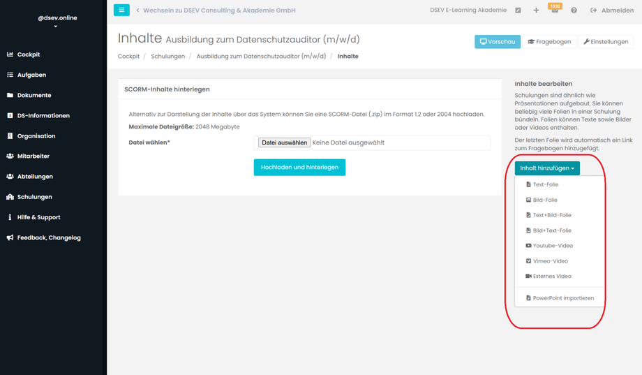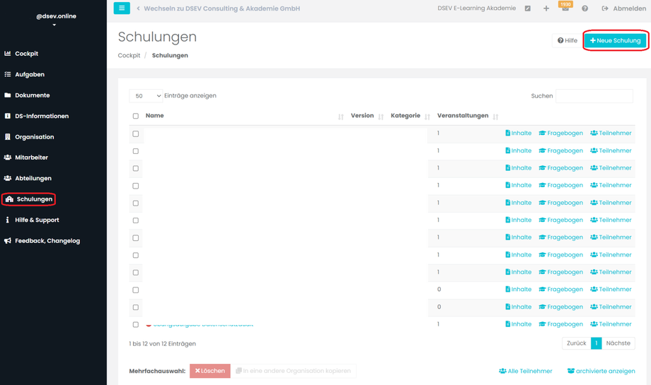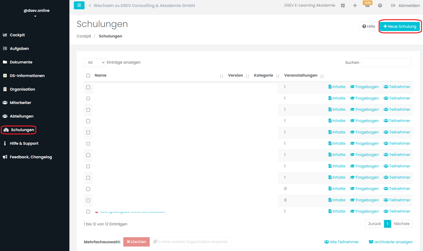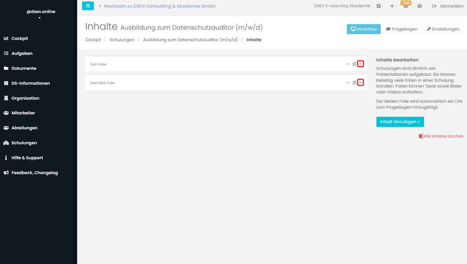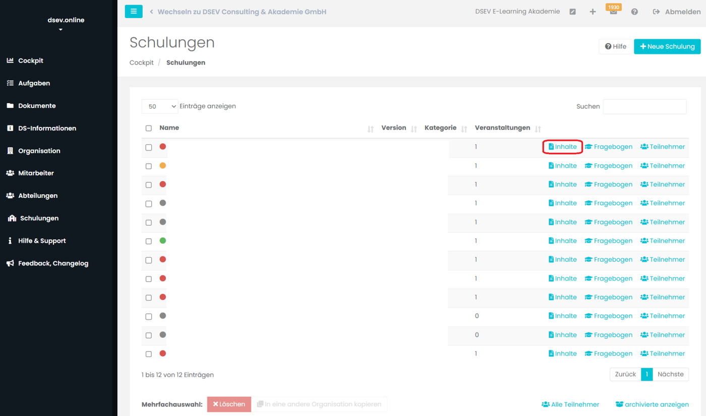 Im Nächsten Schritt klicken Sie in der Schulungsübersicht, hinter dem Namen der Schulung, auf Inhalte. Hier können Sie nun die Schulungsinhalte bestimmen.