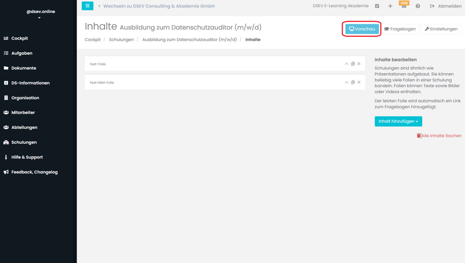 Rechts oben über den Button Vorschau können Sie die Kursinhalte im Schnelldurchlauf betrachten.