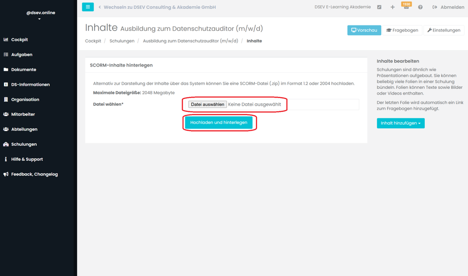 Hier können Sie entweder aus ihren eigenen Unterlagen ein E-Learning erstellen indem Sie eine SCROM-Datei von ihrem Computer auswählen (Datei auswählen) und im Anschluss auf Hochladen und hinterlegen klicken.