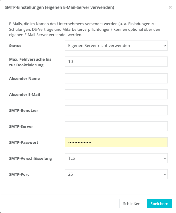 WICHTIG: Sie haben die Möglichkeit, eigene SMTP-Daten zu hinterlegen. Somit kann das System über die eingegebene E-Mail-Adresse Nachrichten verschicken.