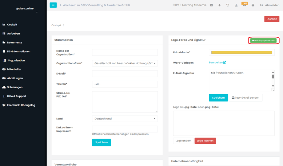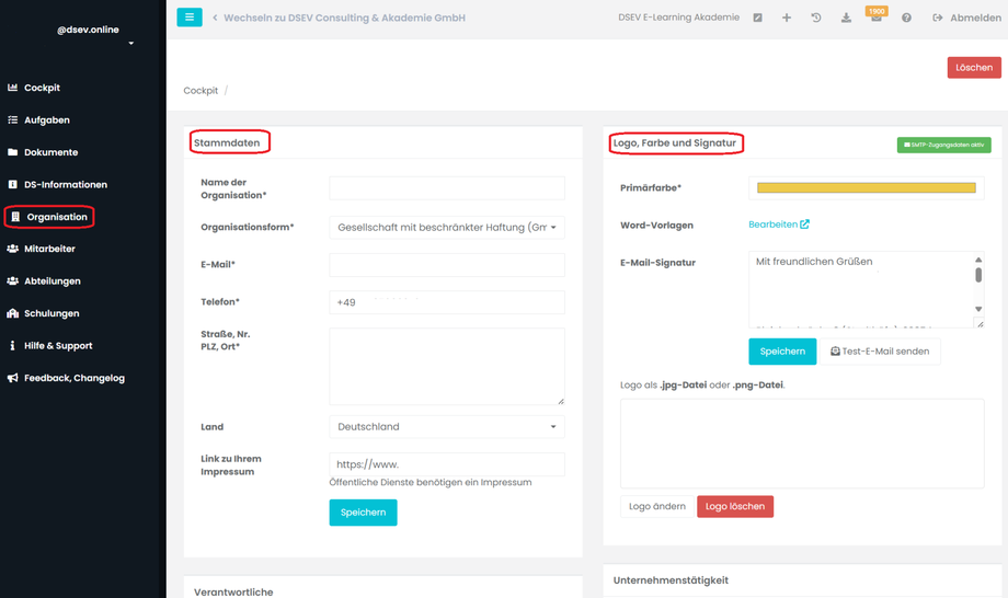 Hier können Sie auch die Corporate Farbe festlegen und das Logo der Organisation hochladen.
