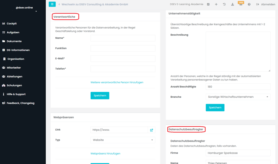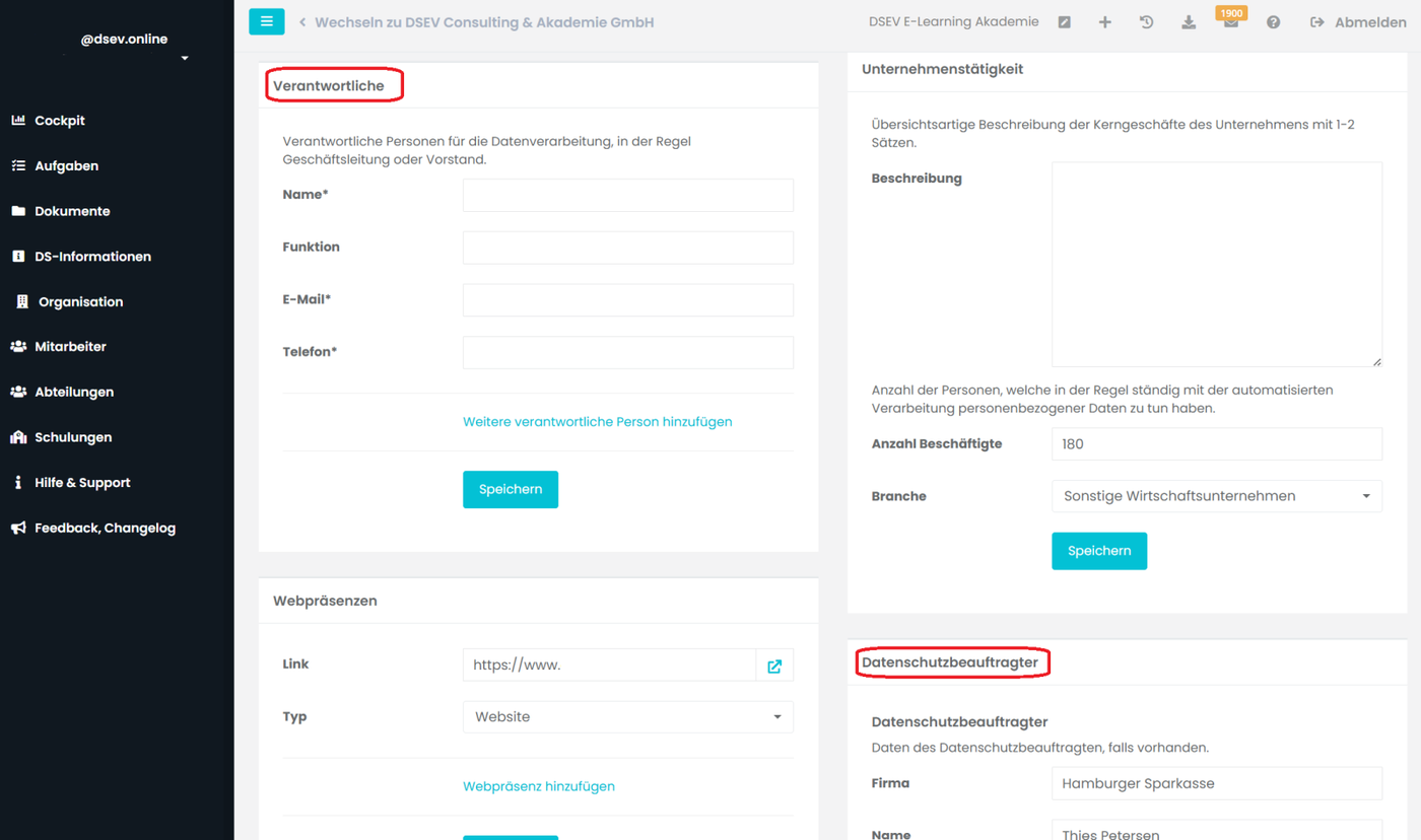 Der Verantwortliche ist gemäß DSGVO die Geschäftsleitung, der Vorstand etc. Der Verantwortliche ist nicht der Datenschutzbeauftragte. Dieser wird in der rechten Spalte erfasst.