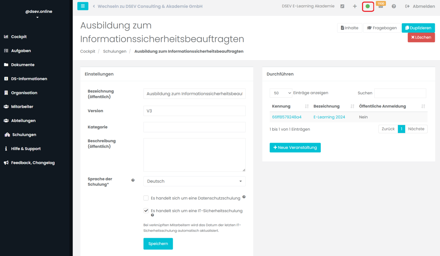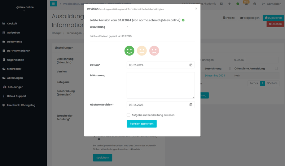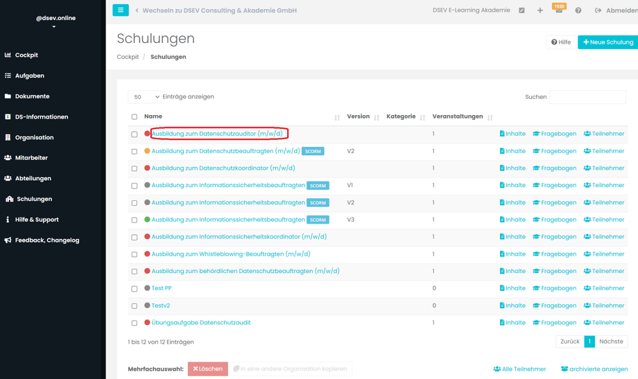 Für Schulungen, Dokumente etc. können Revisionen hinterlegt werden. Gehen Sie hierfür auf Schulungen und klicken Sie auf die entsprechende Schulung, für die Sie eine Revision durchführen möchten.
