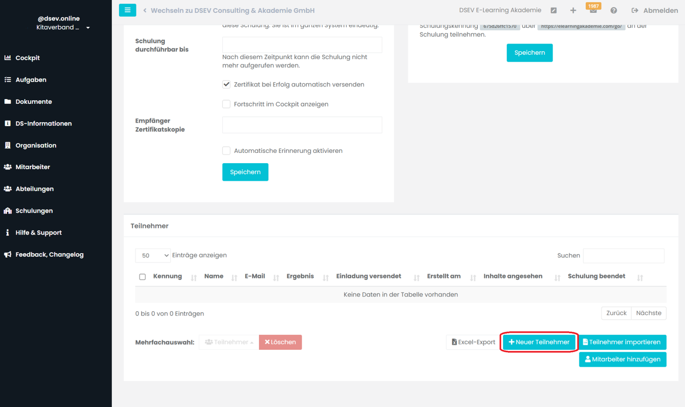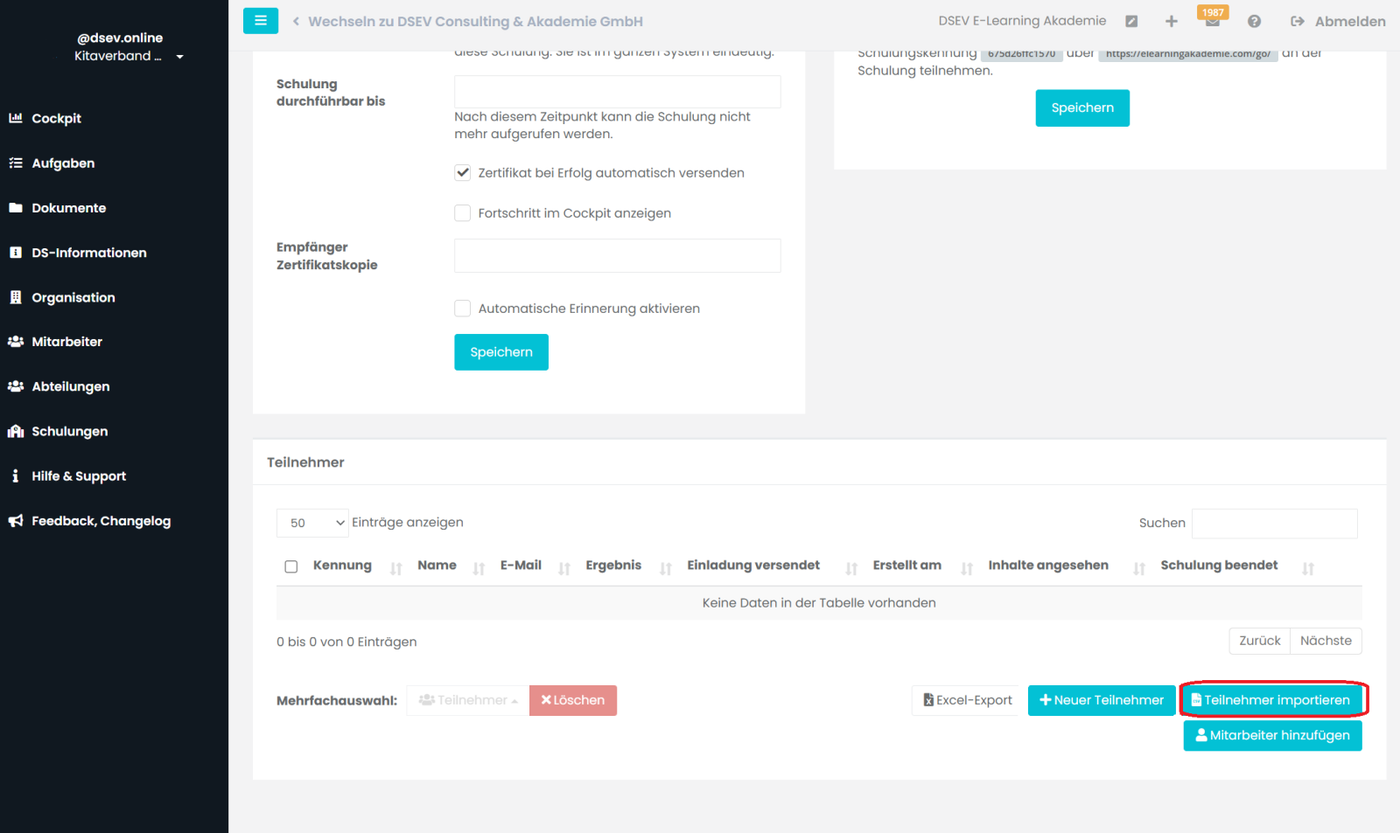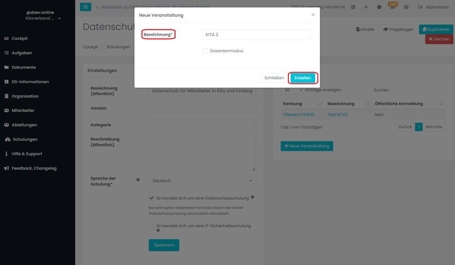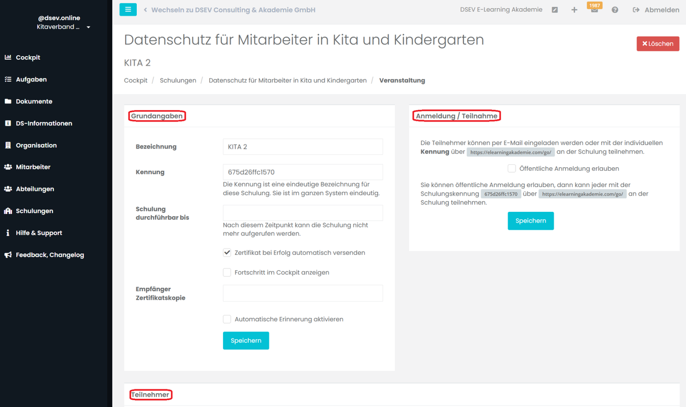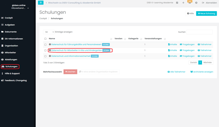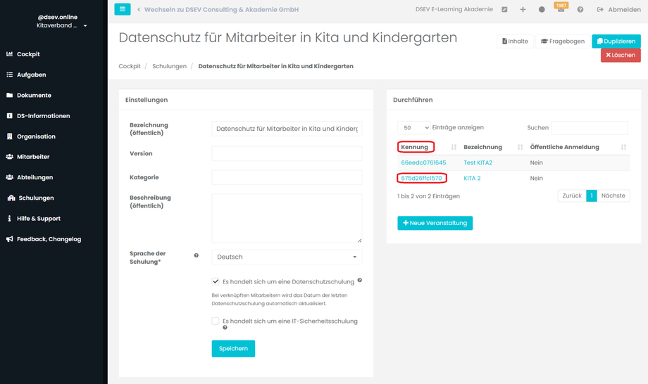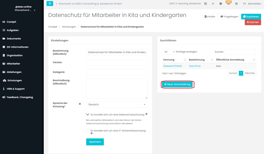 Schulungen verwalten am Beispiel einer KITA (Das Anlegen und Erstellen einer Schulung wird in Kapitel A und C beschrieben).