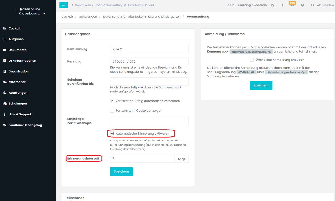 Sie können automatische Erinnerungen zur Durchführung der Schulung an die Mitarbeiter versenden. Setzen Sie dafür einen Haken bei Automatische Erinnerung aktivieren und geben Sie das Erinnerungsintervall an.