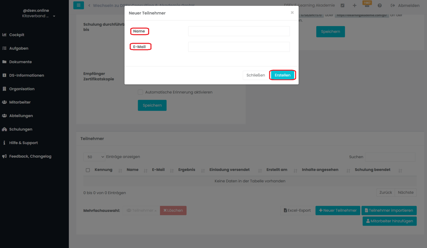 Wählen Sie den Button + Neue Teilnehmer. Anschließend geben Sie Namen und E-Mail Adresse ein und wählen Erstellen aus.