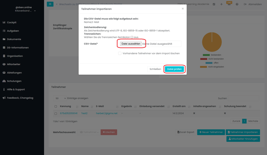 Wählen sie über Datei auswählen die CSV-Liste von Ihrem Rechner aus und gehen Sie auf Datei prüfen. Anschließend können Sie die Datei importieren.