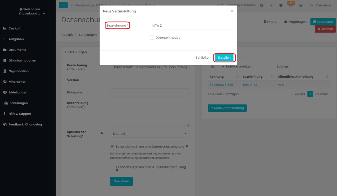 Gehen Sie dafür auf + Neue Veranstaltung und geben Sie in der Bezeichnung den Namen der KITA ein. Klicken Sie anschließend auf Erstellen.