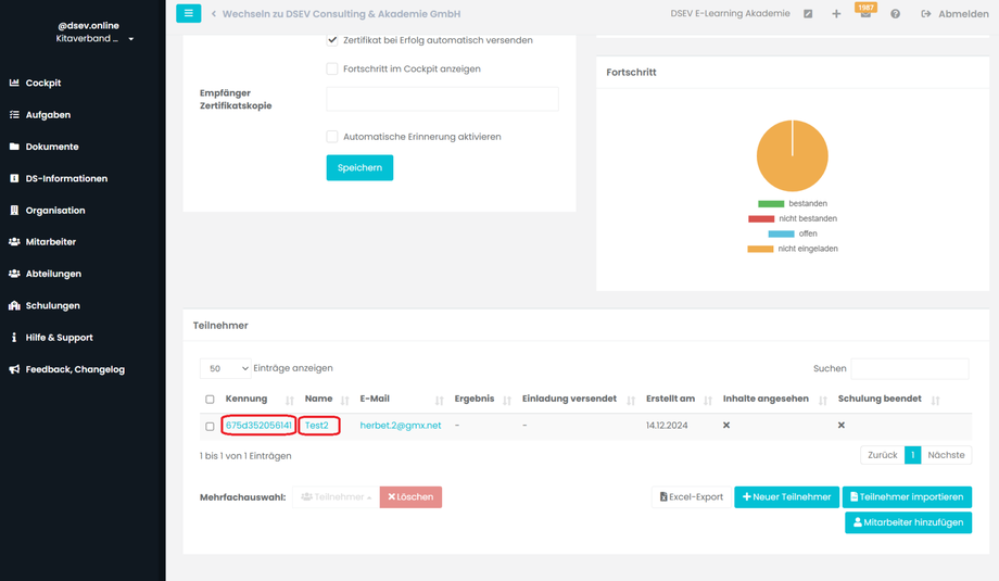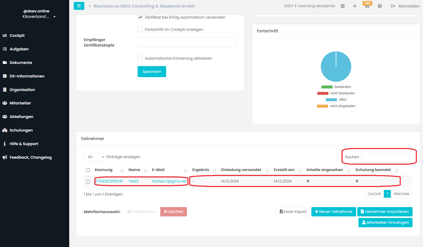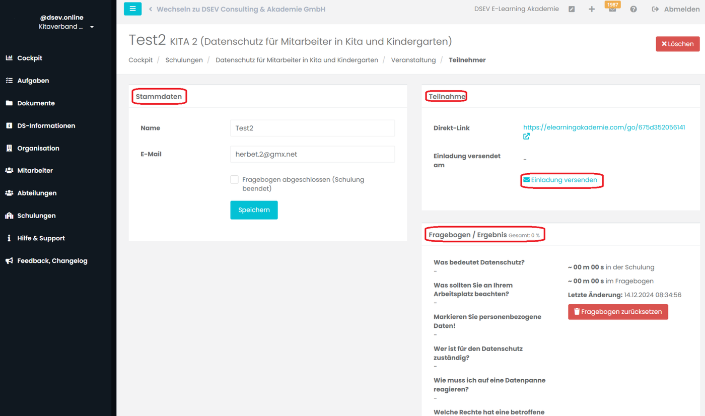 Jetzt erscheinen drei neue Kacheln. In der Kachel Teilnahme klicken Sie auf Einladung versenden. Der Teilnehmer erhält sofort die Einladung per E-Mail.