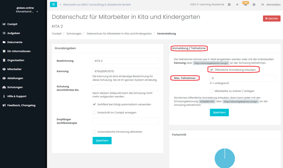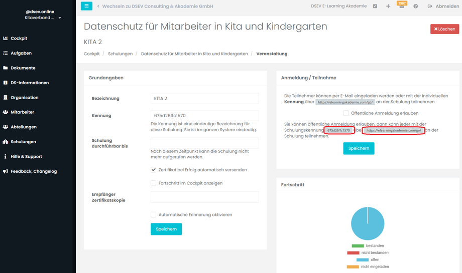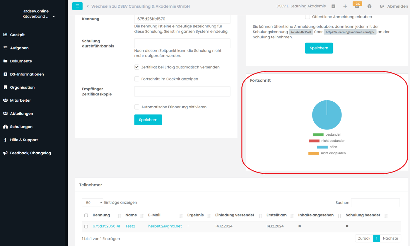 Der Fortschritt bringt einen schnellen Überblick über die bisherige Akzeptanz der Schulung. Klicken Sie dafür wieder auf die gewünschte Veranstaltung (Organisation/Gruppe). Rechts unten sehen Sie die Kachel Fortschritt.