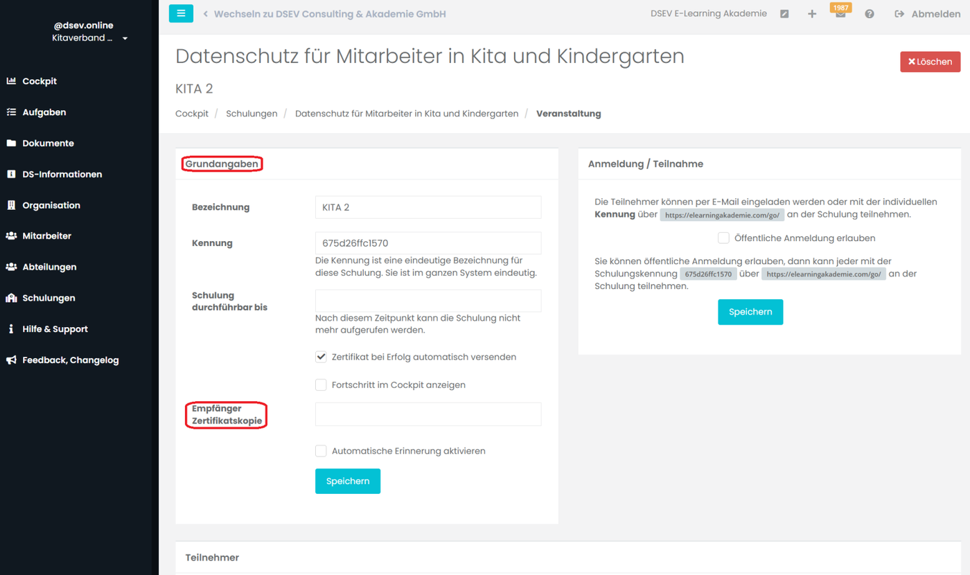 In der Kachel Grundangaben muss bei Empfänger Zertifikatskopie die E-Mail eingepflegt werden unter der die Zertifikate der jeweiligen Kita gesammelt werden. Das kann z.B. die Leitung oder der Träger sein. WICHTIG: Nur so können bei Teilnehmern ohne E-Mail, die Zertifikate automatisch zugeordnet werden.