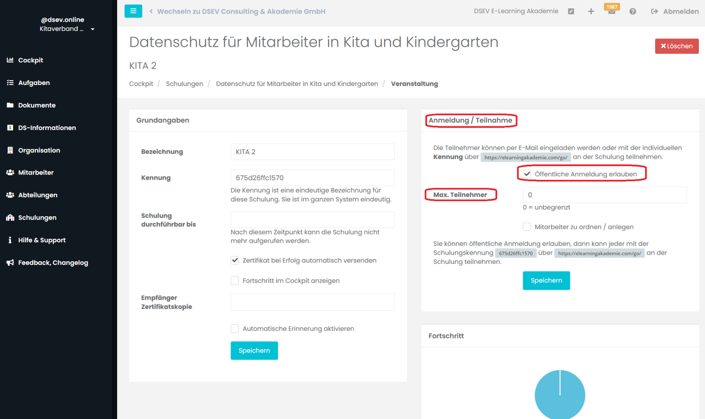 In der Kachel Anmeldung / Teilnahme besteht die Möglichkeit Teilnehmenden ohne E-Mail Adresse die Teilnahme an der Schulung zu ermöglichen. Sie müssen dafür die Option Öffentliche Anmeldung erlauben auswählen. Tragen Sie die bestellte Anzahl von Lizenzen unter Max. Teilnehmer ein.
