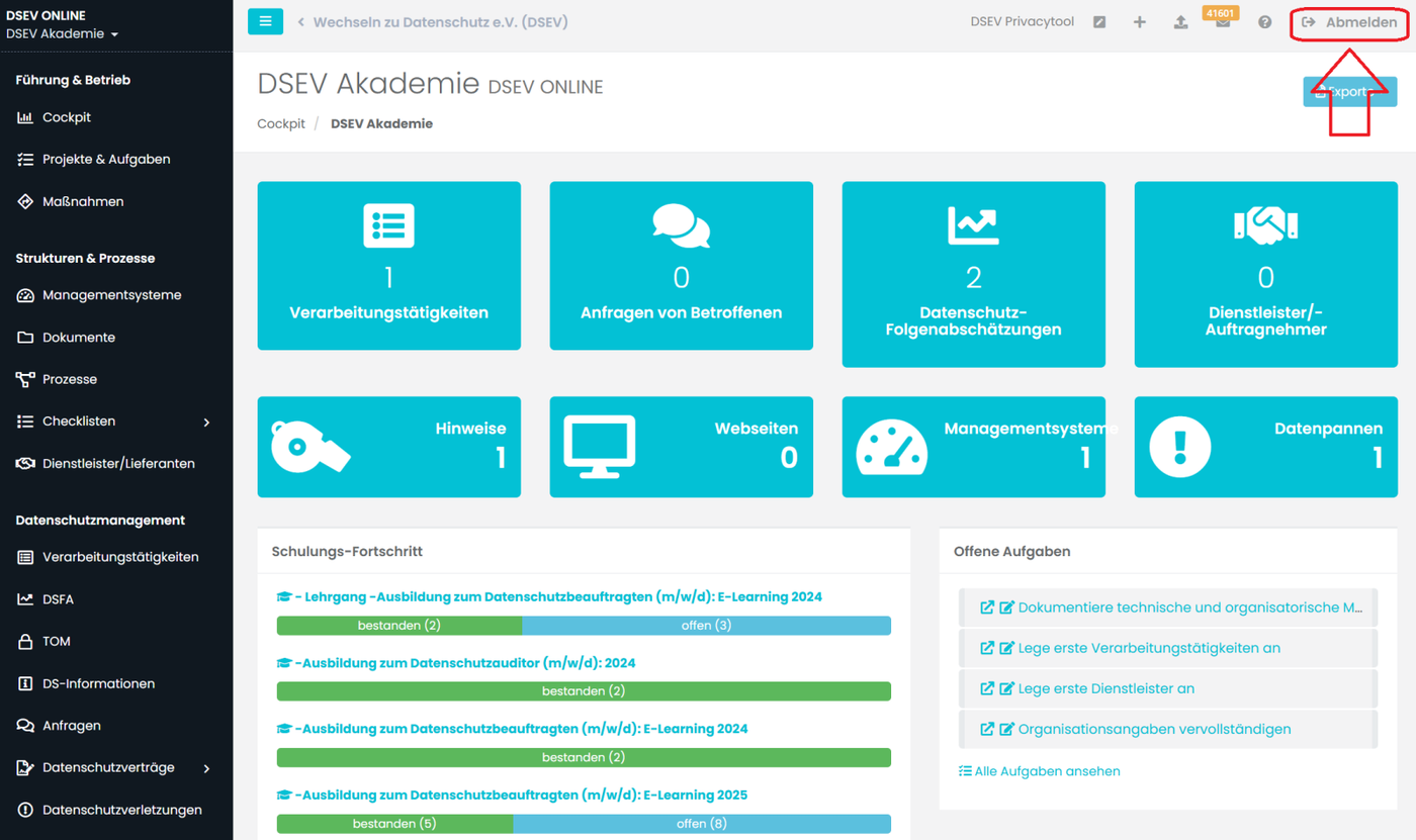 Die Abmeldung vom System kann über den „Abmelden“-Button in der oberen rechten Ecke des Bildschirms vorgenommen werden.