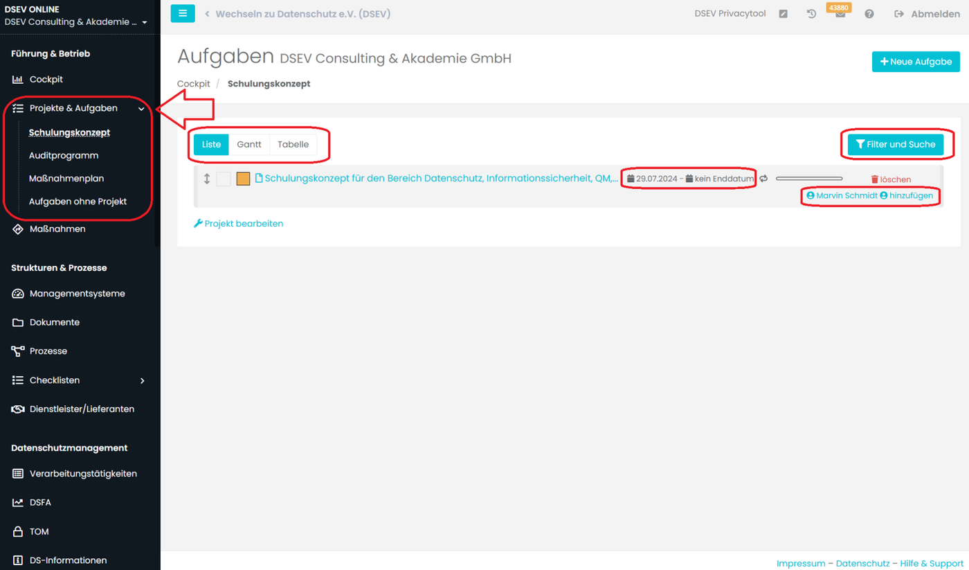 Es können Aufgaben für bestimmte Projekte (Schulungskonzept, Auditprogramm, Maßnahmenplan) erstellt werden oder auch Aufgaben ohne Projekt.