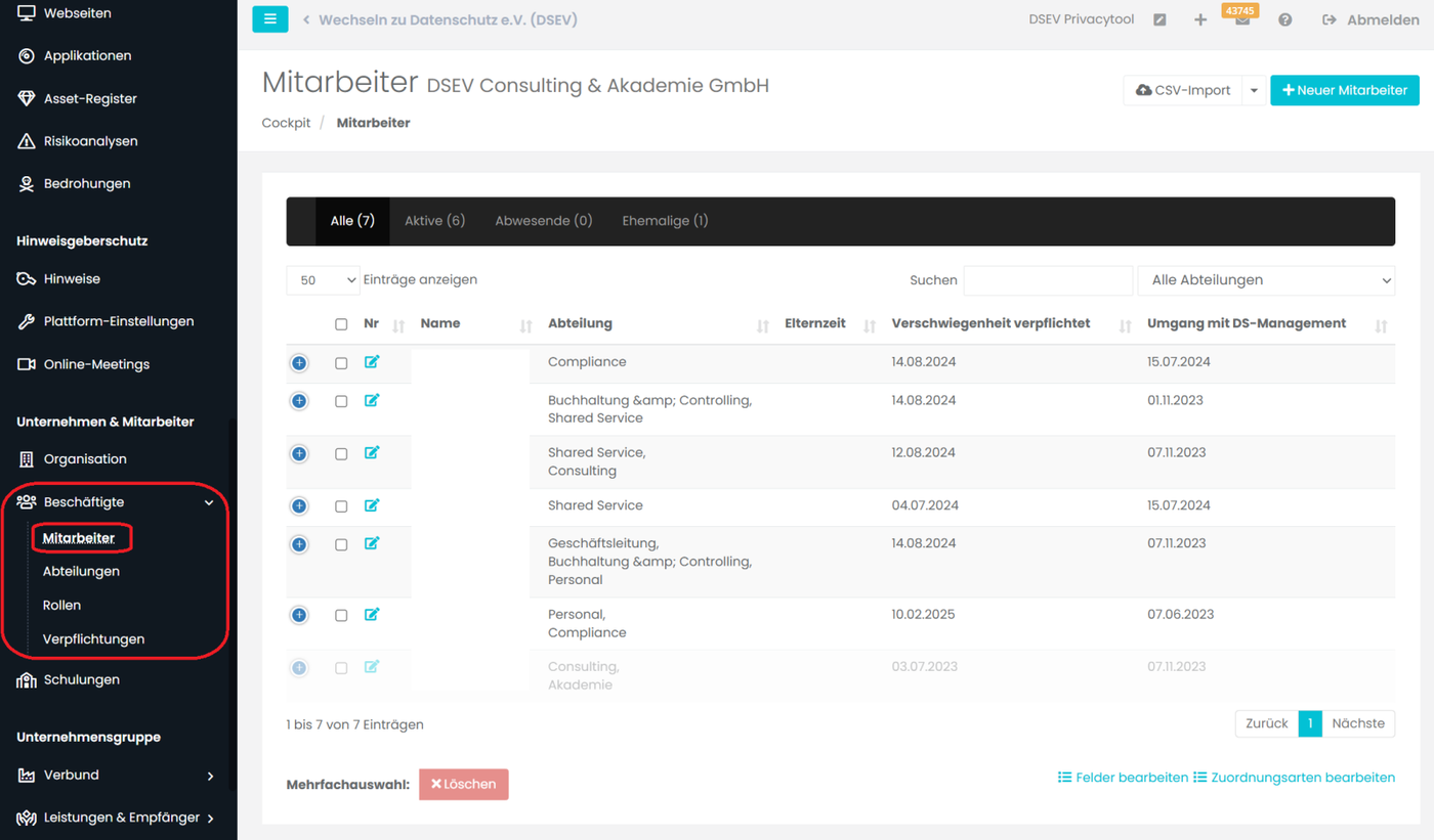Hier legen Sie Ihre Mitarbeiter bzw. Gruppen an. Zudem können Sie Informationen zu den Mitarbeitern einpflegen (wann diese zur Verschwiegenheit verpflichtet wurden, wann die letzte Schulung stattfand etc.). Nachweise können direkt hochgeladen werden. Auch Online-Verpflichtungen oder Einwilligungen können Sie direkt versenden und online unterzeichnen lassen.