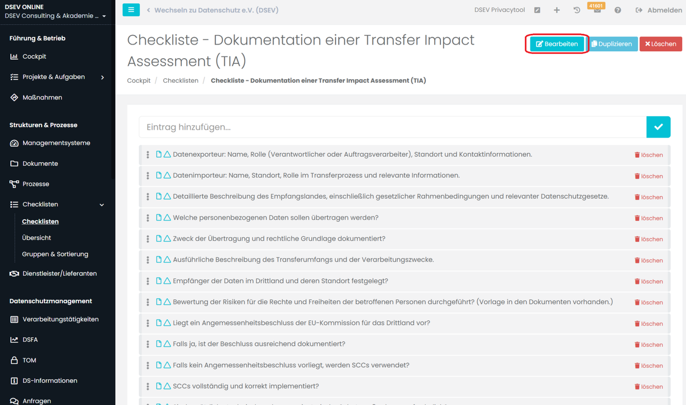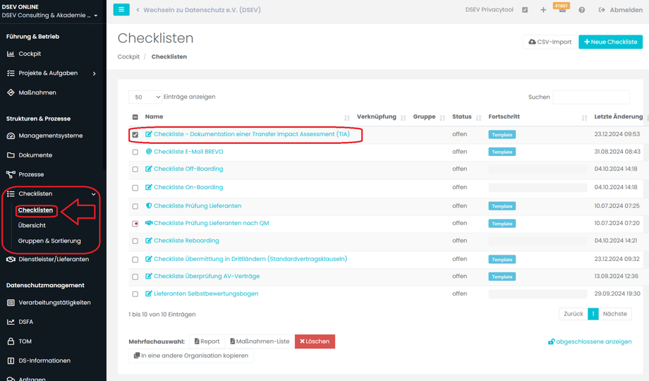 Wichtig: wenn Sie z.B. eine Checkliste zur Überprüfung von Auftragsverarbeitungsverträge nutzen, müssen Sie nicht immer eine neue Checkliste anlegen.