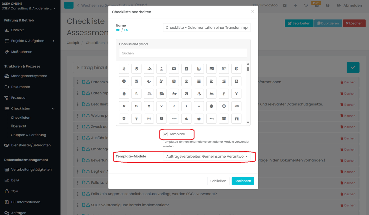Hier können Sie den Punkt „Template“ auswählen. Sobald diese Checkliste als Template angelegt ist, können Sie auswählen, wo Sie diese Checkliste verwenden wollen, z.B. Auftragsverarbeiter. Dann steht diese im jeweiligen Modul zur Verfügung.