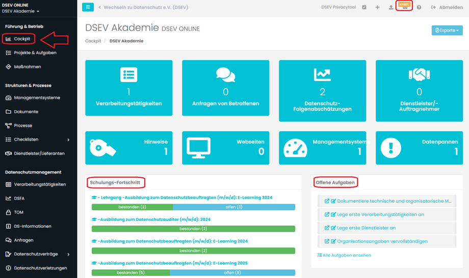 Das Cockpit, die Startseite, zeigt Ihnen den aktuellen Stand Ihres Datenschutzes. Die grünen Bereiche zeigen das bisher Erreichte, die roten Bereiche zeigen, was noch zu tun ist.