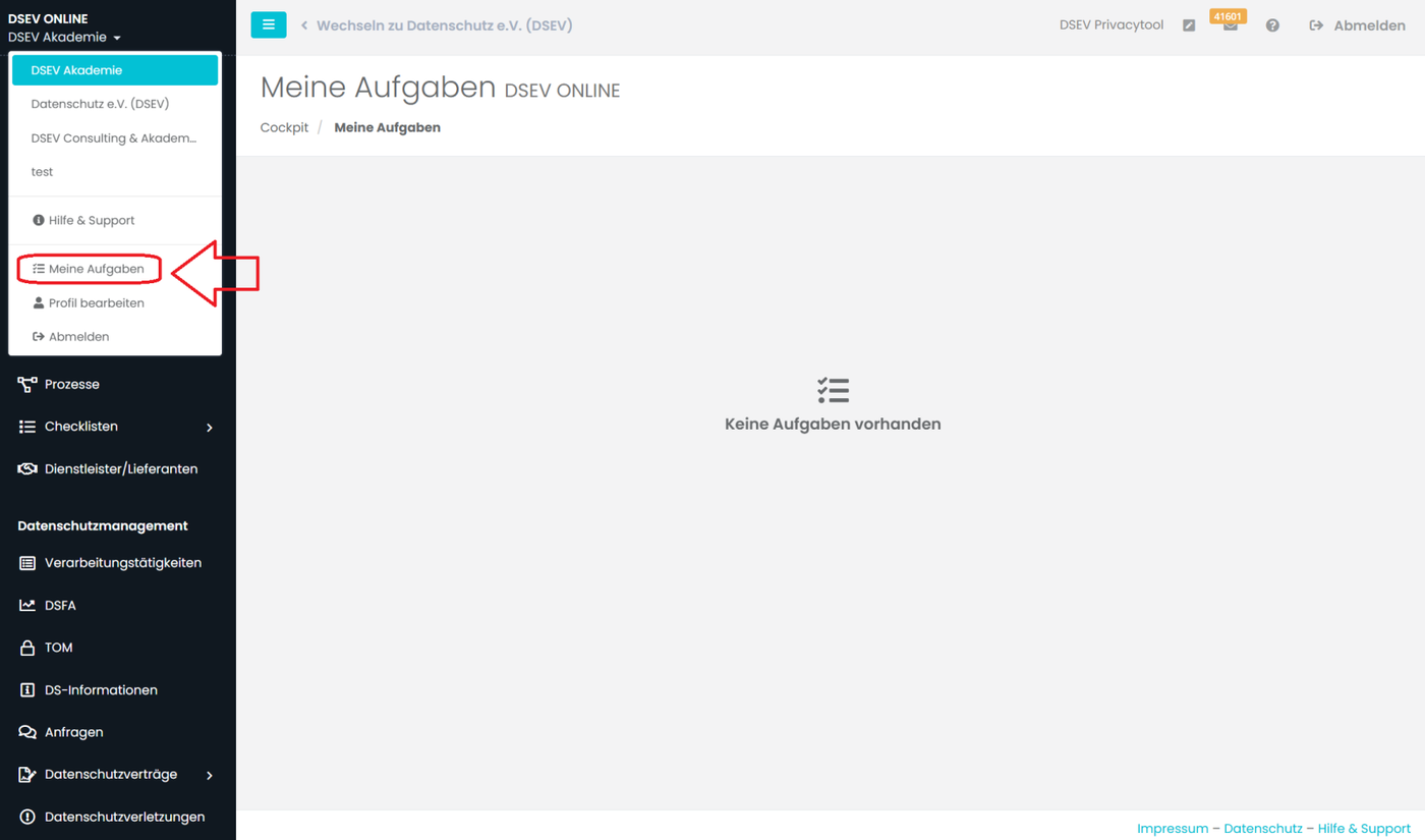 Unter Meine Aufgaben im Dropdown-Menü sehen Sie Ihre eigenen zugewiesenen Aufgaben. Status Informationen erhalten Sie an Ihre E-Mail-Adresse.