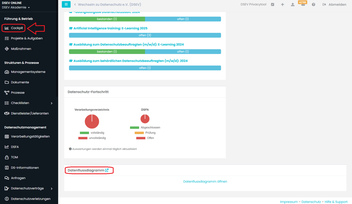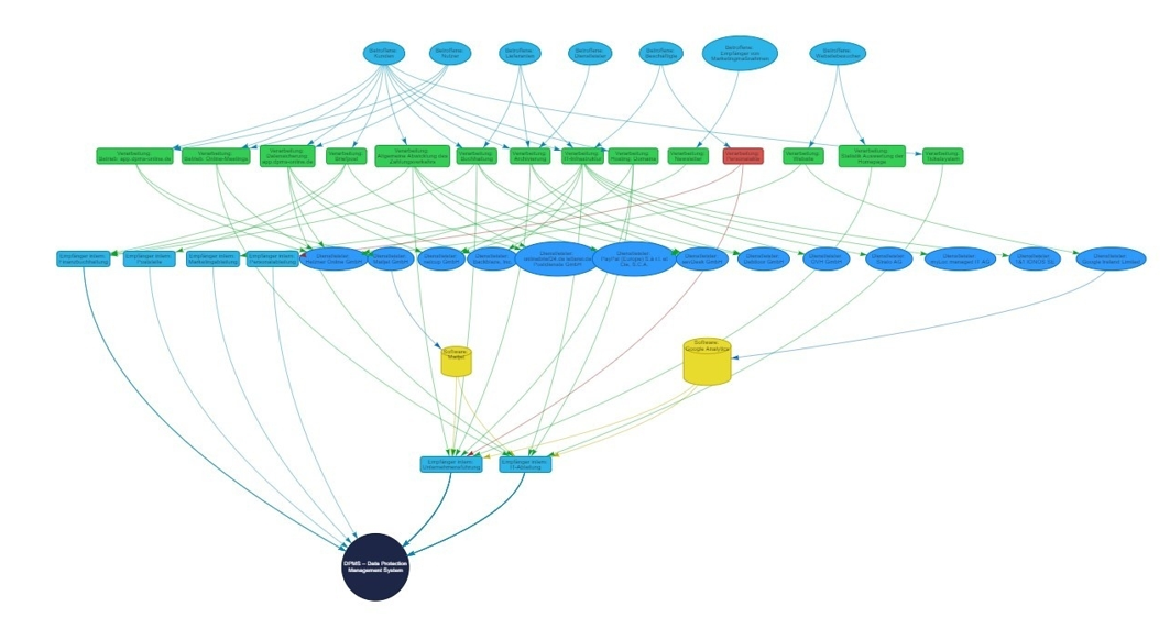 Aus den Angaben im Verarbeitungsverzeichnis wird automatisch ein Datenflussdiagramm erzeugt. So erhalten Sie einen schnellen Überblick, welche Kategorien von betroffenen Personen es im Unternehmen gibt, welche Daten erfasst, von wem sie empfangen werden und von wem sie verarbeitet werden.