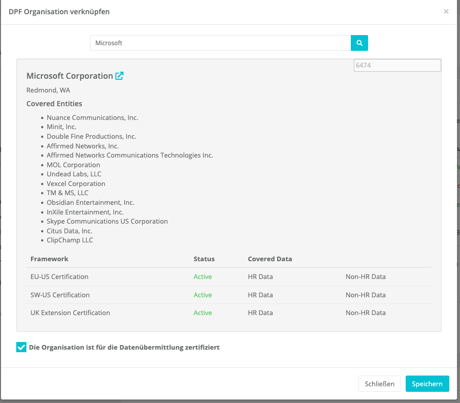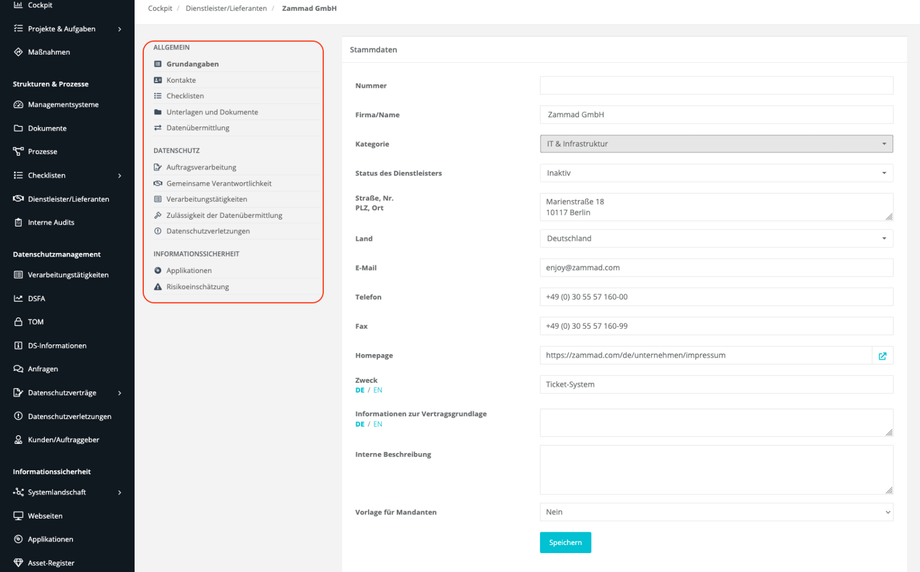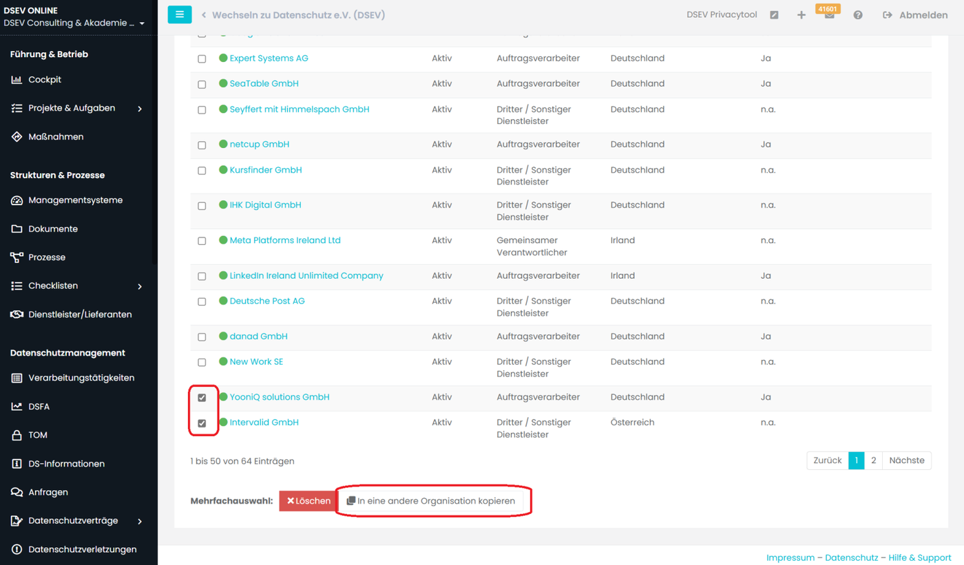- Bereich Datenübermittlung: Erfassung weiterer Standorte, Unterauftragnehmer und verbundener Organisationen des Dienstleisters/Lieferanten