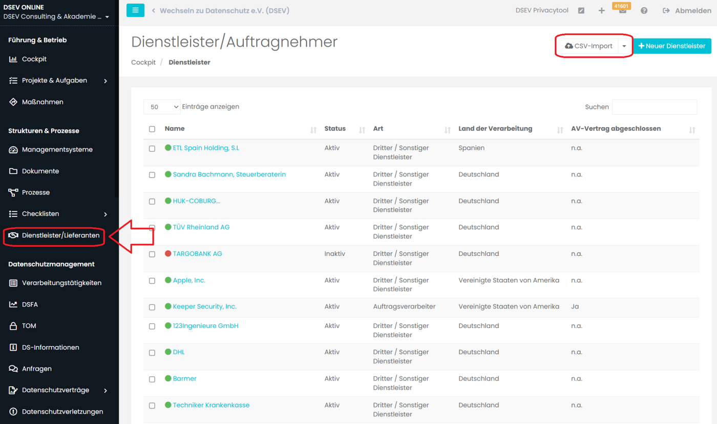 In dem Modul Dienstleister/Lieferanten haben Sie die Möglichkeit, Dienstleister und Lieferanten/Auftragnehmer anzulegen. Hier werden alle Verträge zur Auftragsverarbeitung, Verträge zur gemeinsamen Verantwortung sowie andere Verträge (z.B. NDA) hinterlegt.