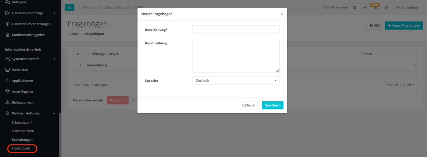 Um einen neuen Fragebogen zu erstellen, gehen Sie wie folgt vor: