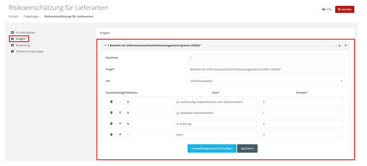 Benennen Sie die Bewertung (z. B. „Risikoeinschätzung für Lieferanten“) und klicken Sie auf Speichern.