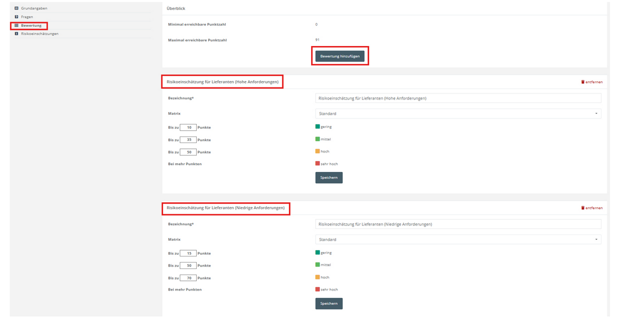 Definieren Sie die Schwellen der Matrix (z. B. „bis zu 10 Punkte = gering“, „bis zu 35 = mittel“, „bis zu 50 = hoch“, „mehr = sehr hoch“). Der Gesamtpunktestand wird automatisch einer Risikokategorie zugeordnet. Sie haben die Möglichkeit, mehrere Bewertungen hinzuzufügen - je nach Sicherheitsanforderung des Lieferanten.