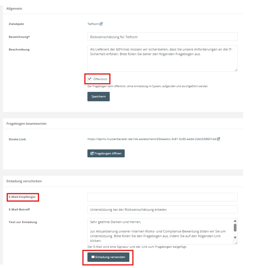 Geben Sie einen E-Mail-Empfänger an und klicken Sie auf Einladung versenden. Der Lieferant erhält einen Link, um den Fragebogen im Browser zu öffnen und zu bearbeiten.