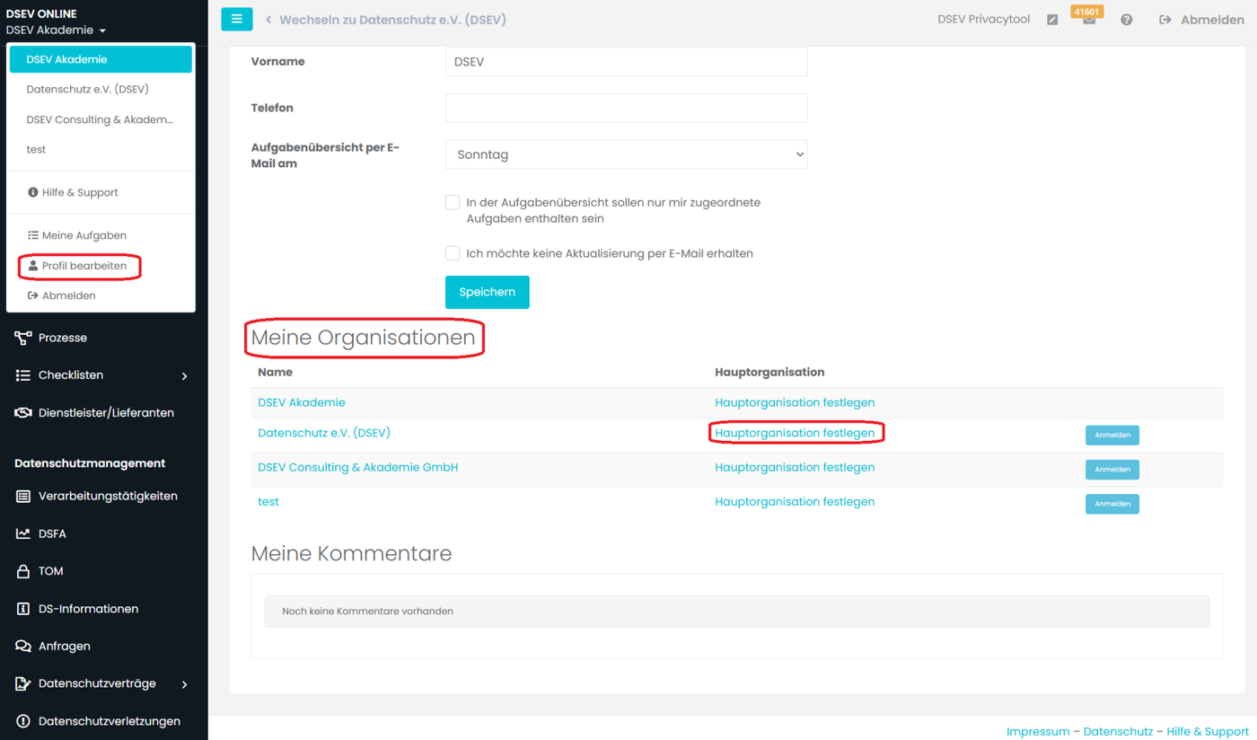 Mit einem Klick auf „Hauptorganisation festlegen“ können Sie die Organisation auswählen, die nach dem Login standardmäßig aktiv sein soll.