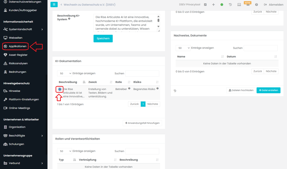 Die KI-Dokumentation (Informationssicherheit - Applikationen) ermöglicht es Ihnen, KI-Systeme innerhalb Ihrer Organisation zentral zu erfassen und zu verwalten. Sie unterstützt die systematische Aufzeichnung relevanter Informationen, wie Zweck, Rolle und Risiken, die mit dem Einsatz von KI-Systemen verbunden sind. Dies stellt einen ersten Schritt zur Erfüllung der Anforderungen der KI-Verordnung der EU dar und bildet die Grundlage für eine strukturierte Erfassung und Nachvollziehbarkeit der KI-Einsätze in Ihrer Organisation.