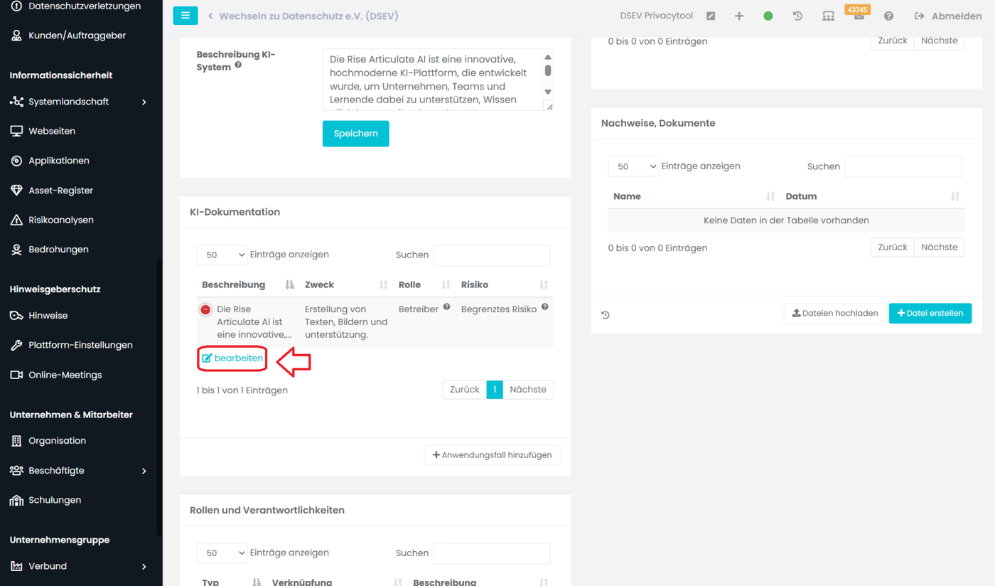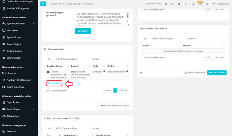 Bestehende Einträge können Sie flexibel über die Schaltfläche „Bearbeiten“ anpassen oder bei Bedarf löschen. Neue Einträge erstellen Sie bequem über „+ KI-Dokumentation hinzufügen“.
