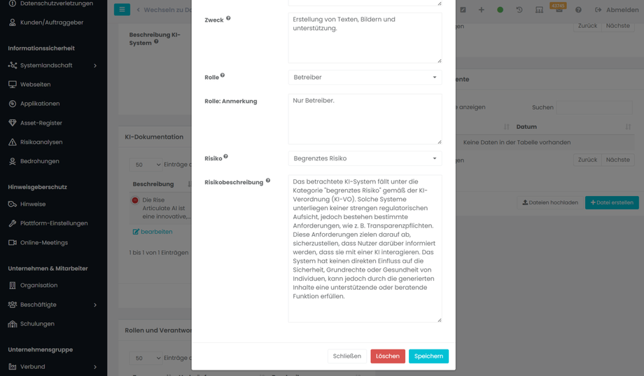 - Risiko: Einschätzung des Risikos (z. B. „Begrenztes Risiko“).