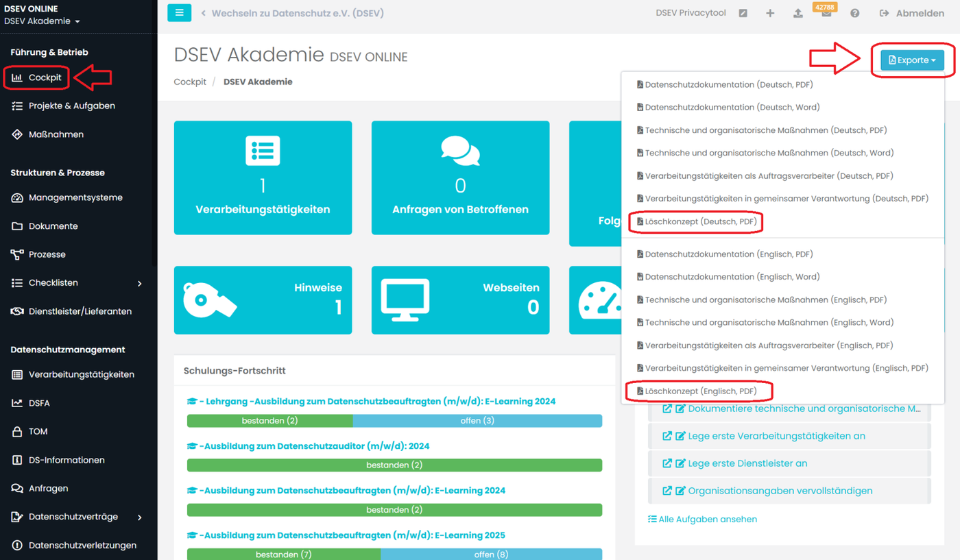 Aus den hinterlegten Verarbeitungstätigkeiten wird automatisch ein Löschkonzept erzeugt. Das Löschkonzept ergibt sich aus der Rechtsgrundlage & Löschung in den Verarbeitungstätigkeiten. Wurde der Punkt nicht vollständig hinterlegt, kann auch kein aussagekräftiges Löschkonzept erzeugt werden.
