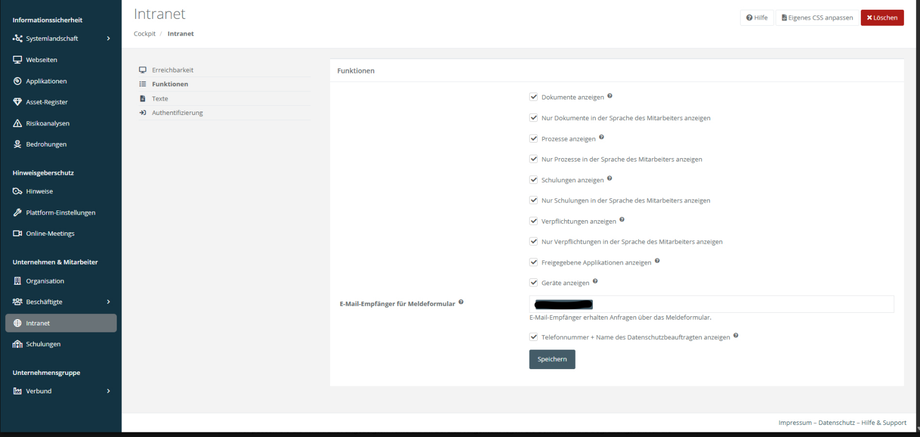 - E-Mail-Empfänger für Meldeformular: Im Intranet wird ein Kontaktformular angezeigt, über das unter anderem IT-Sicherheitsereignisse gemeldet werden können. Hier kann die E-Mail des Empfängers gesetzt werden. Wenn das Hinweisgeber-Modul aktiv ist, wird bei Meldungen zusätzlich darauf hingewiesen.