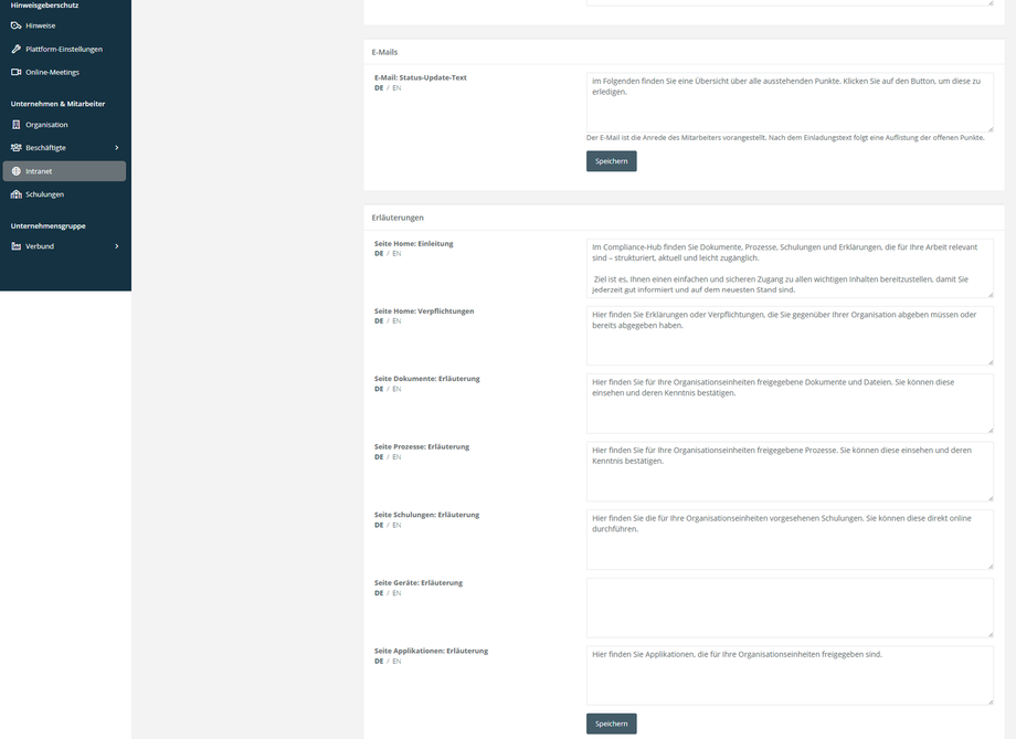 Hier passen Sie die im Intranet angezeigten Texte an. Im Bereich Allgemein legen Sie Seitentitel und Begrüßungstext für die Anmeldeseite fest. Im Abschnitt E-Mails definieren Sie den Inhalt von Status-Update-Mails, mit denen Mitarbeitende über neue oder geänderte Inhalte informiert werden. Unter Erläuterungen hinterlegen Sie Informationstexte für die Startseite sowie für Dokumente, Prozesse, Schulungen, Geräte und Applikationen. Für Vorfall melden können Sie sowohl den Einleitungstext der Seite als auch den Bestätigungstext nach Absenden des Formulars anpassen.
