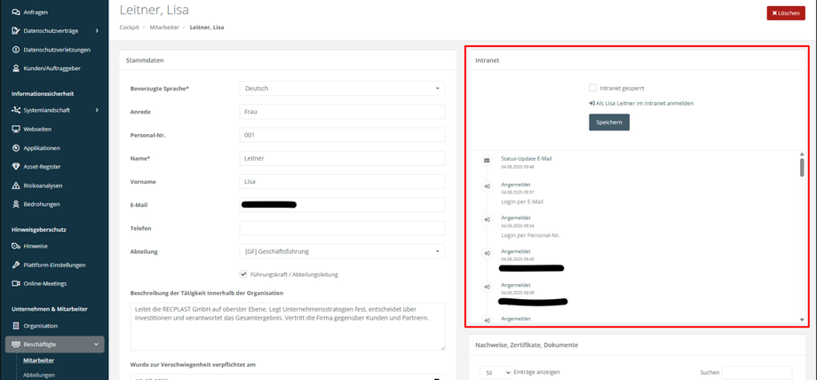 Im Datensatz jedes Mitarbeiters befindet sich ein Bereich Intranet, in dem alle Anmeldungen und relevanten Aktivitäten protokolliert werden. Hier kann auch der Zugang zum Intranet für einzelne Personen gesperrt werden. Änderungen wirken sich sofort aus.