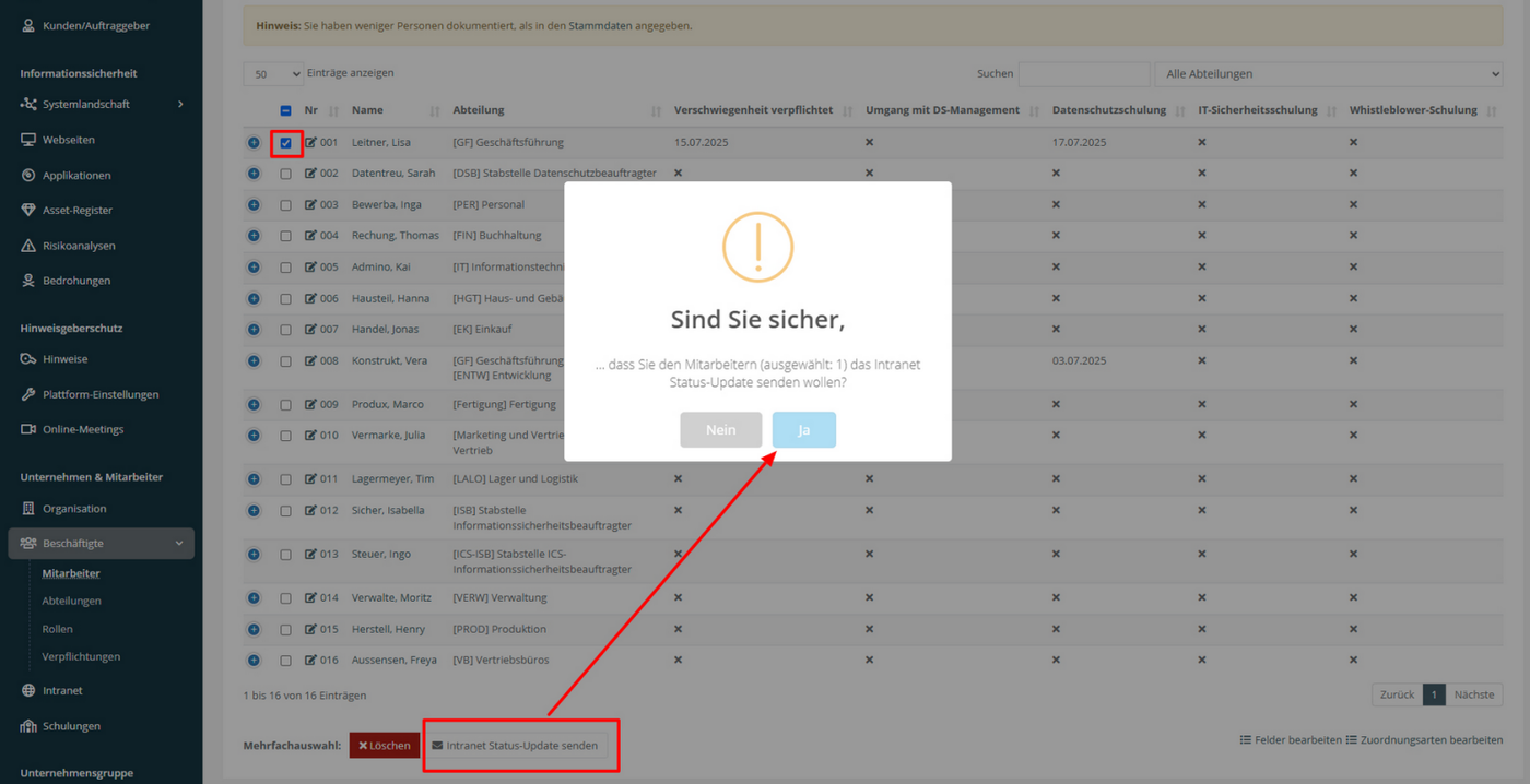 Wenn neue Inhalte veröffentlicht oder bestehende Inhalte geändert werden, können Sie Mitarbeitende optional über eine Status-Update-Mail informieren. Dazu markieren Sie in der Mitarbeiterliste die gewünschten Personen und klicken auf Intranet Status-Update senden. Nach einer Bestätigung wird die E-Mail automatisch versendet und enthält die relevanten Änderungen.