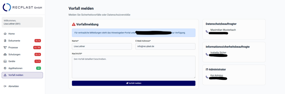 Über ein Formular können Mitarbeitende Sicherheitsvorfälle oder Datenschutzverstöße melden. Optional werden hier Kontaktdaten des Datenschutzbeauftragten, Informationssicherheitsbeauftragten oder IT-Administrators angezeigt.