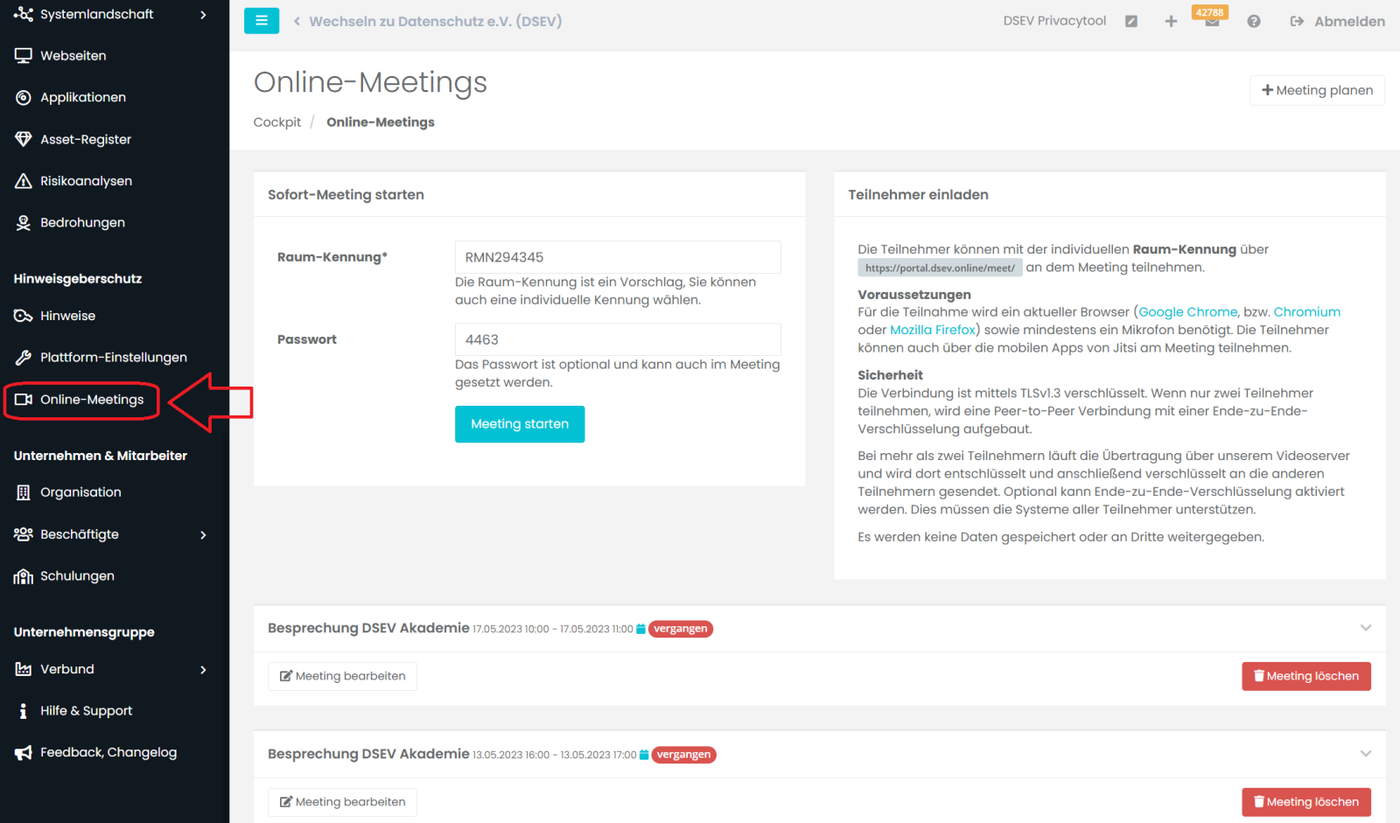 Die Teilnehmer können mit der individuellen Raum-Kennung über https://portal.dsev.online/meet/ an dem Meeting teilnehmen.