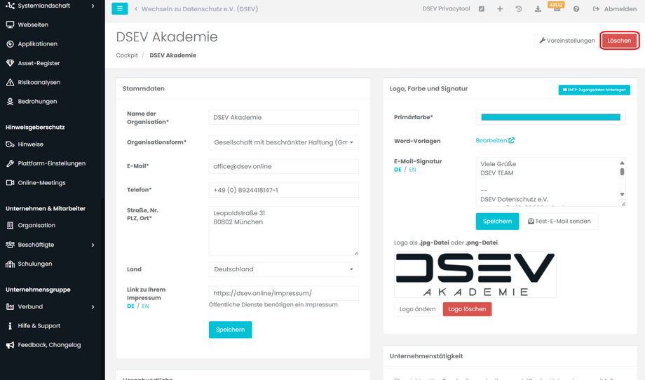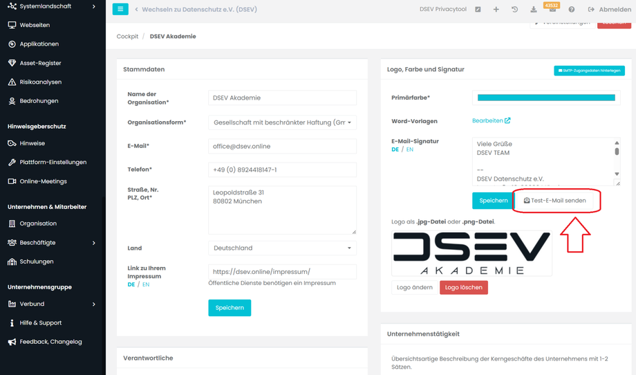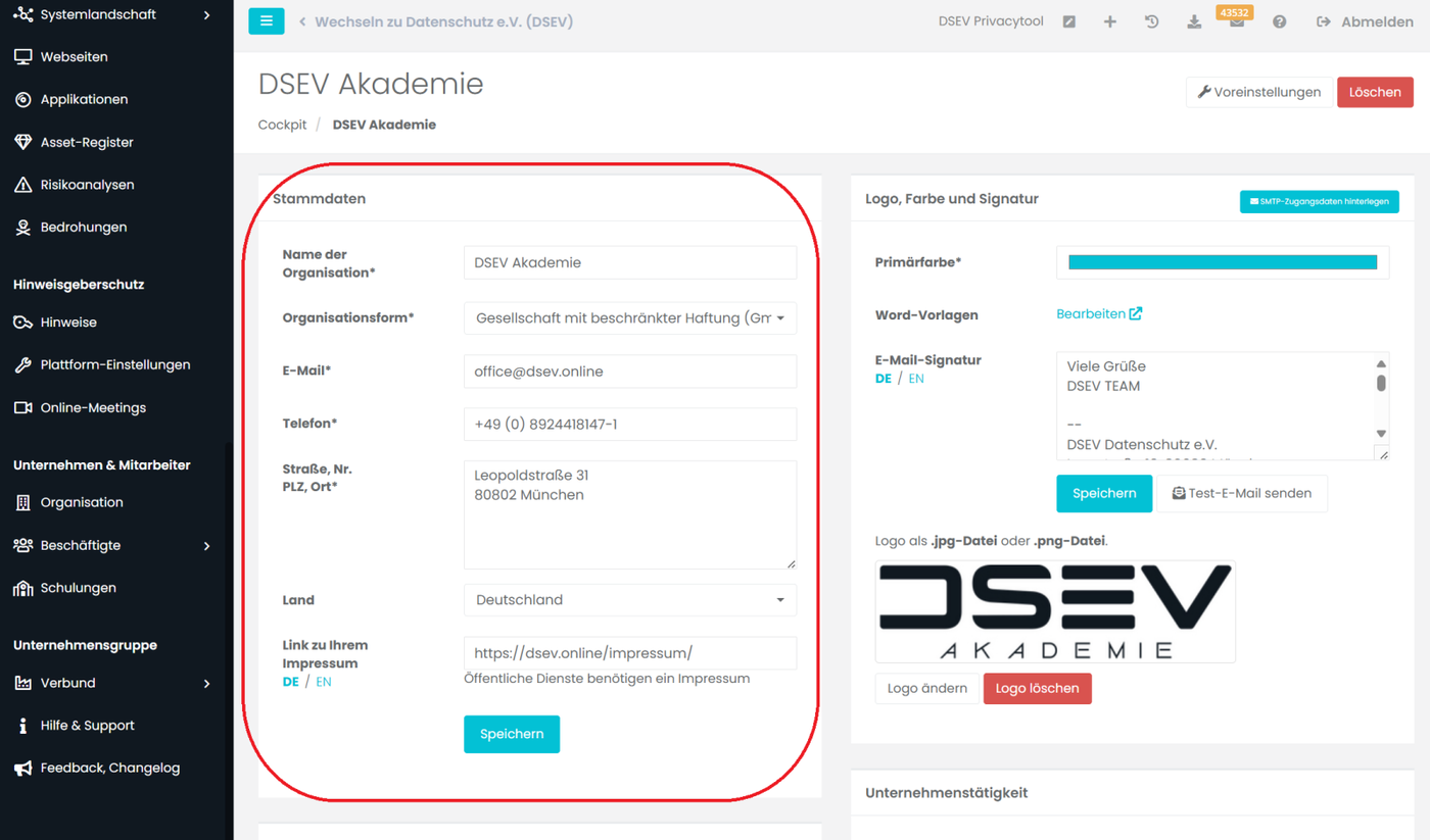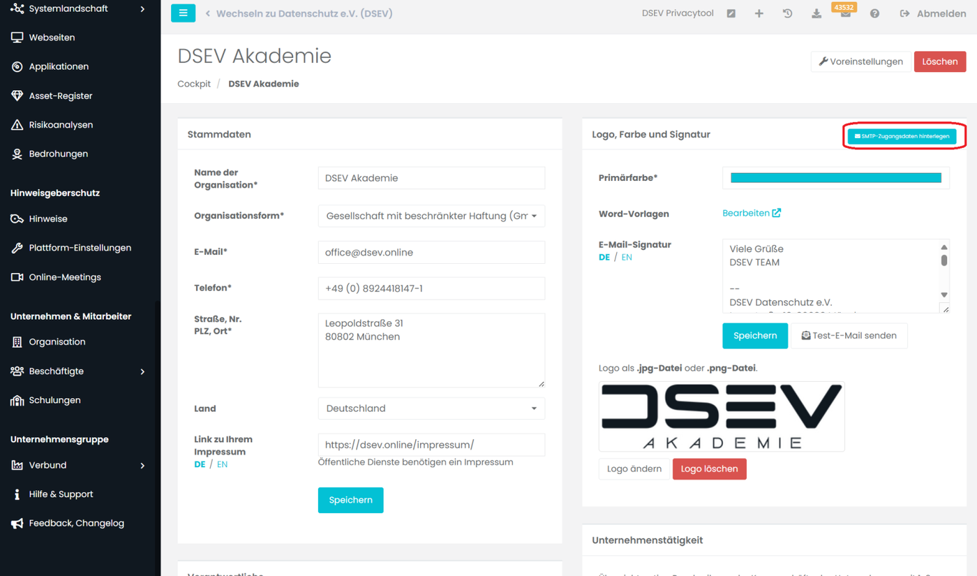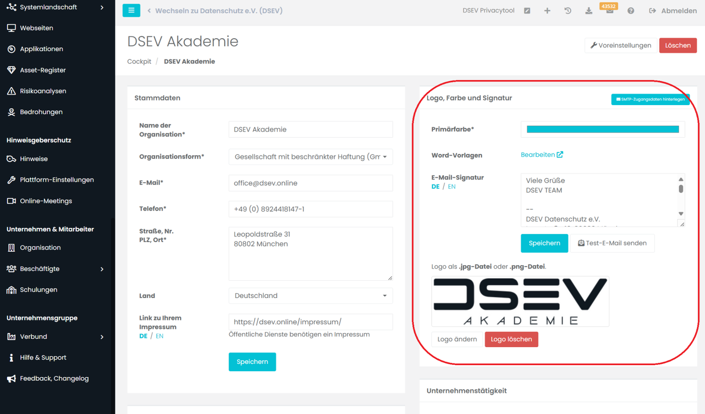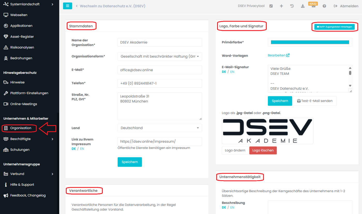 Im Menüpunkt Organisation können Sie die Stammdaten des Unternehmens verwalten, einschließlich Logo, Farbe und Signatur. Zusätzlich können SMTP-Daten hinterlegt werden, um den E-Mail-Versand über einen eigenen SMTP-Server des Unternehmens abzuwickeln. Es lassen sich auch Informationen zur Unternehmenstätigkeit und zur Mitarbeiteranzahl erfassen. Daten zum internen oder externen Datenschutzbeauftragten sowie die zuständige Behörde sollten ebenfalls eingetragen werden. Unter Benutzer sehen Sie, welche Benutzer mit welcher Rolle Zugriff auf die Organisation haben