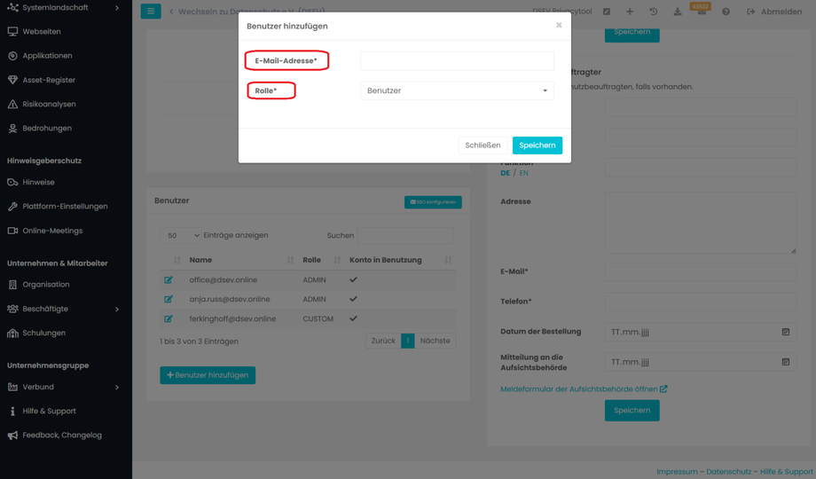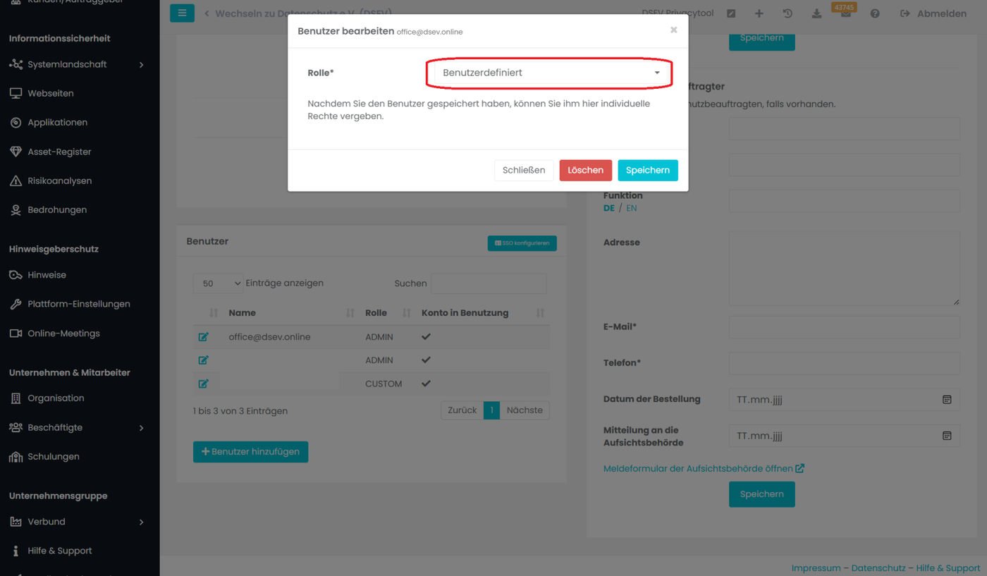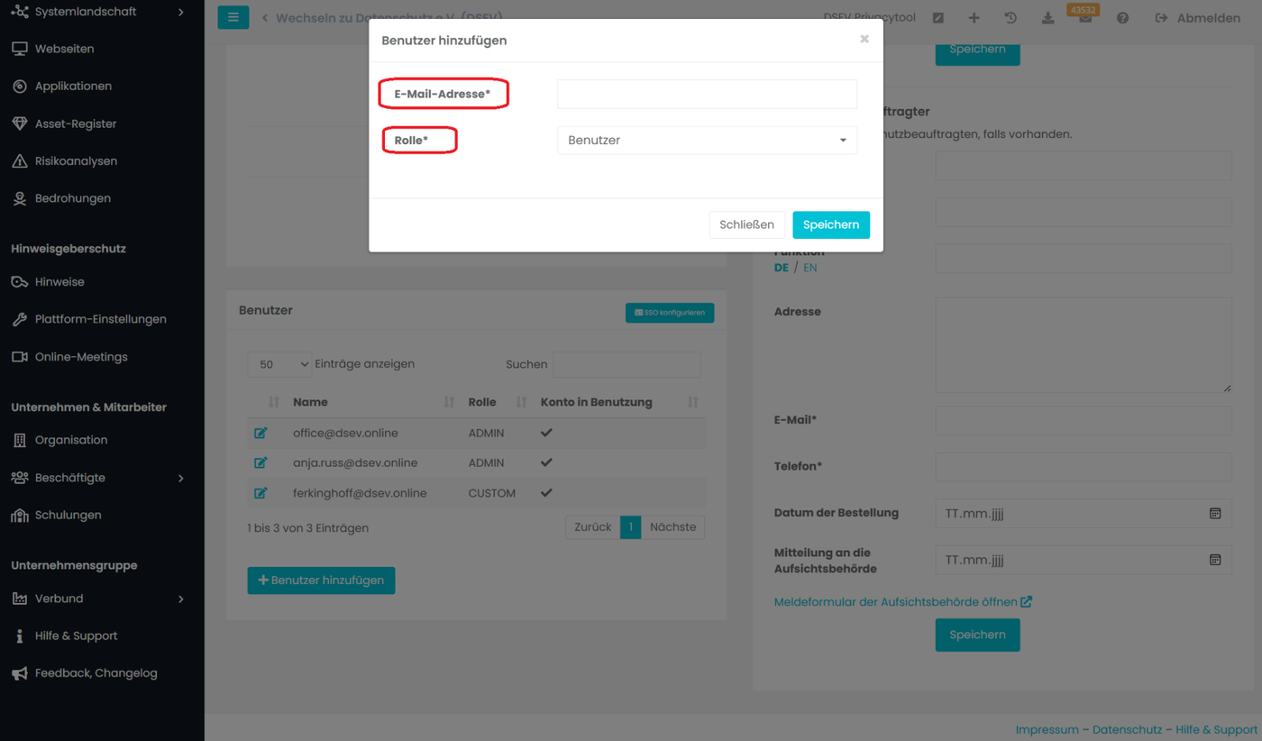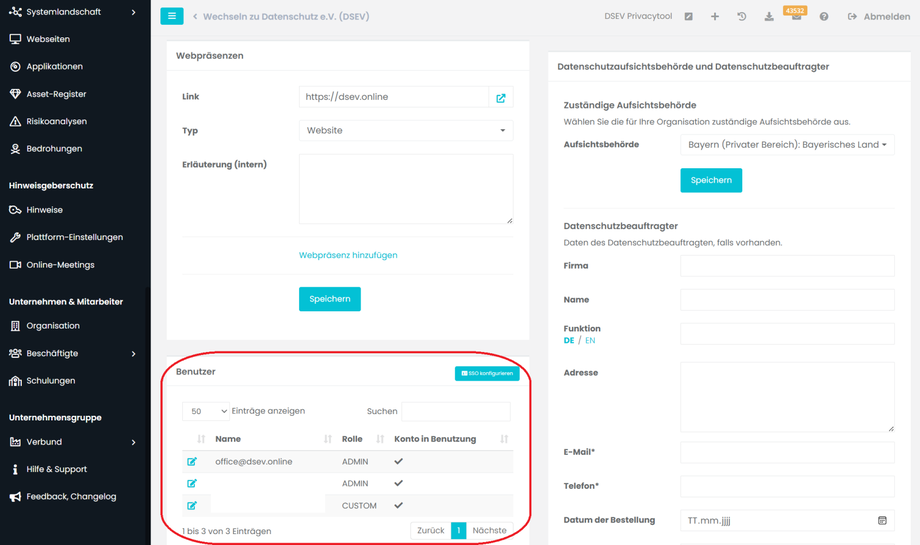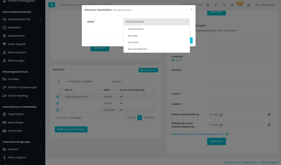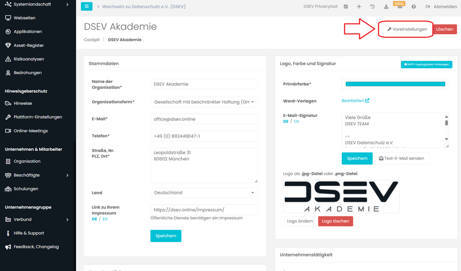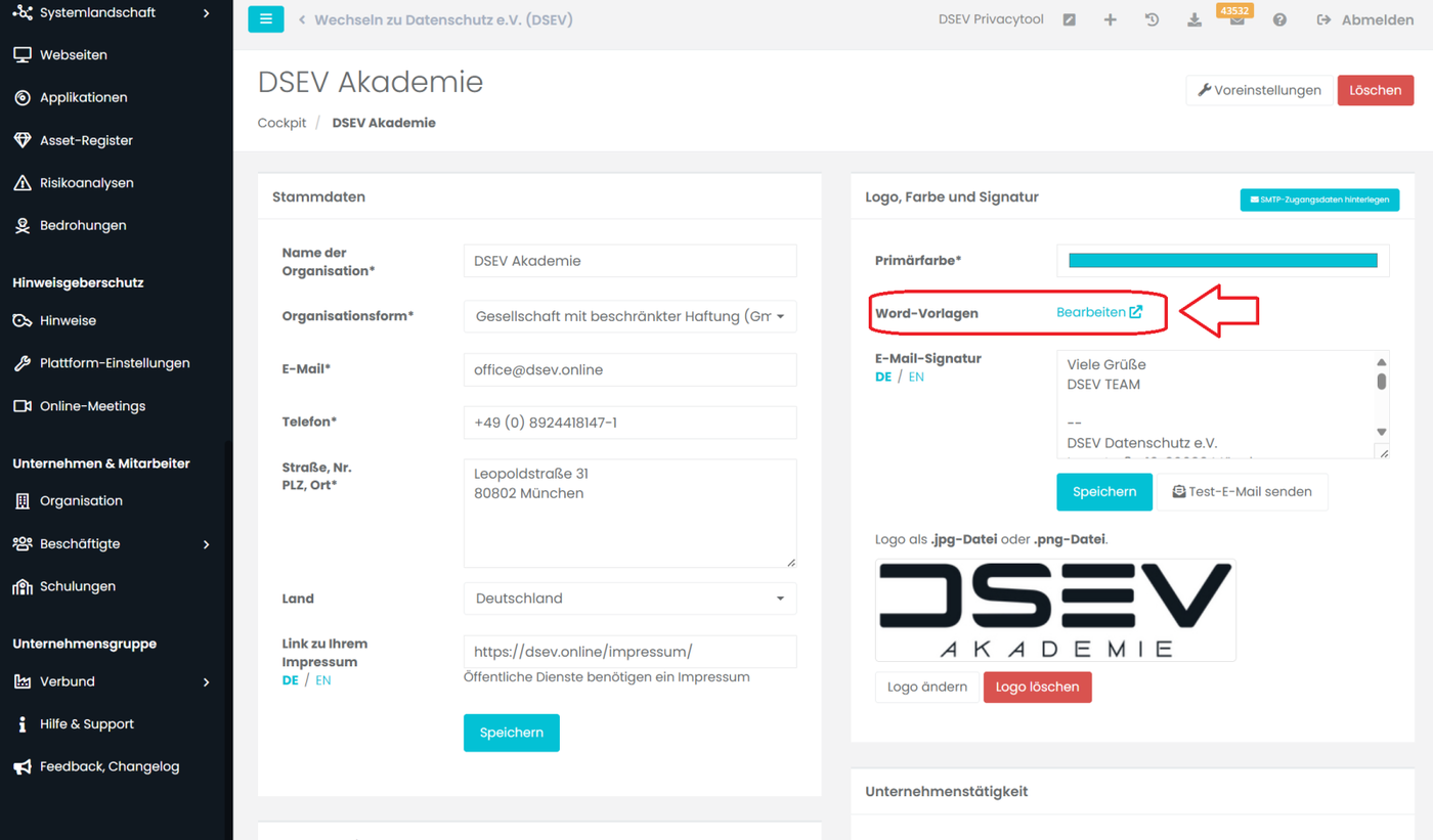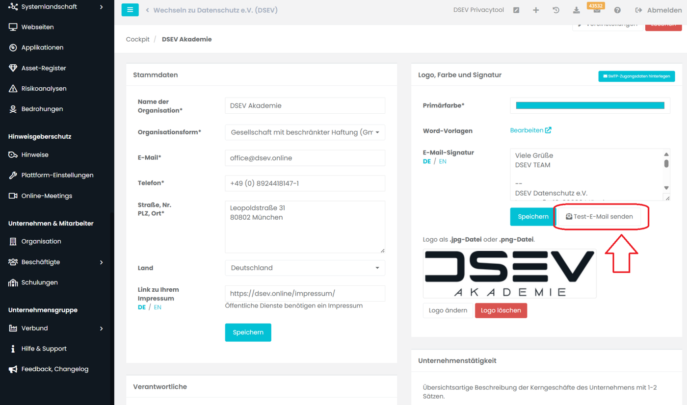 Im Menüpunkt Organisation können Sie die Stammdaten des Unternehmens verwalten, einschließlich Logo, Farbe und Signatur. Zusätzlich können SMTP-Daten hinterlegt werden, um den E-Mail-Versand über einen eigenen SMTP-Server des Unternehmens abzuwickeln. Es lassen sich auch Informationen zur Unternehmenstätigkeit und zur Mitarbeiteranzahl erfassen. Daten zum internen oder externen Datenschutzbeauftragten sowie die zuständige Behörde sollten ebenfalls eingetragen werden. Unter Benutzer sehen Sie, welche Benutzer mit welcher Rolle Zugriff auf die Organisation haben